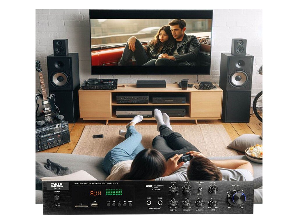DNA AMPLI 5.0 je 5.0 kanálový zesilovač vybavený Bluetooth připojením, FM rádiem a také USB vstupem a čtečkou SD karet. Jedná se o model z řady DNA HOME, která byla vytvořena speciálně pro domácí použití. Tento všestranný systém byl navržen především pro karaoke, které je možné díky dvěma mikrofonním vstupům s ovládáním echa. DNA AMPLI 5.0 nabízí pět kanálů, které obslouží všechny reproduktory potřebné k dosažení nejvyšší kvality prostorového zvuku. Skladby lze přehrávat přímo z USB vstupu nebo SD karty, stejně jako prostřednictvím bezdrátového připojení k vaší digitální knihovně přes Bluetooth. Navíc můžete poslouchat své oblíbené rozhlasové stanice v prostorovém HiFi zvuku díky FM rádiovému tuneru.