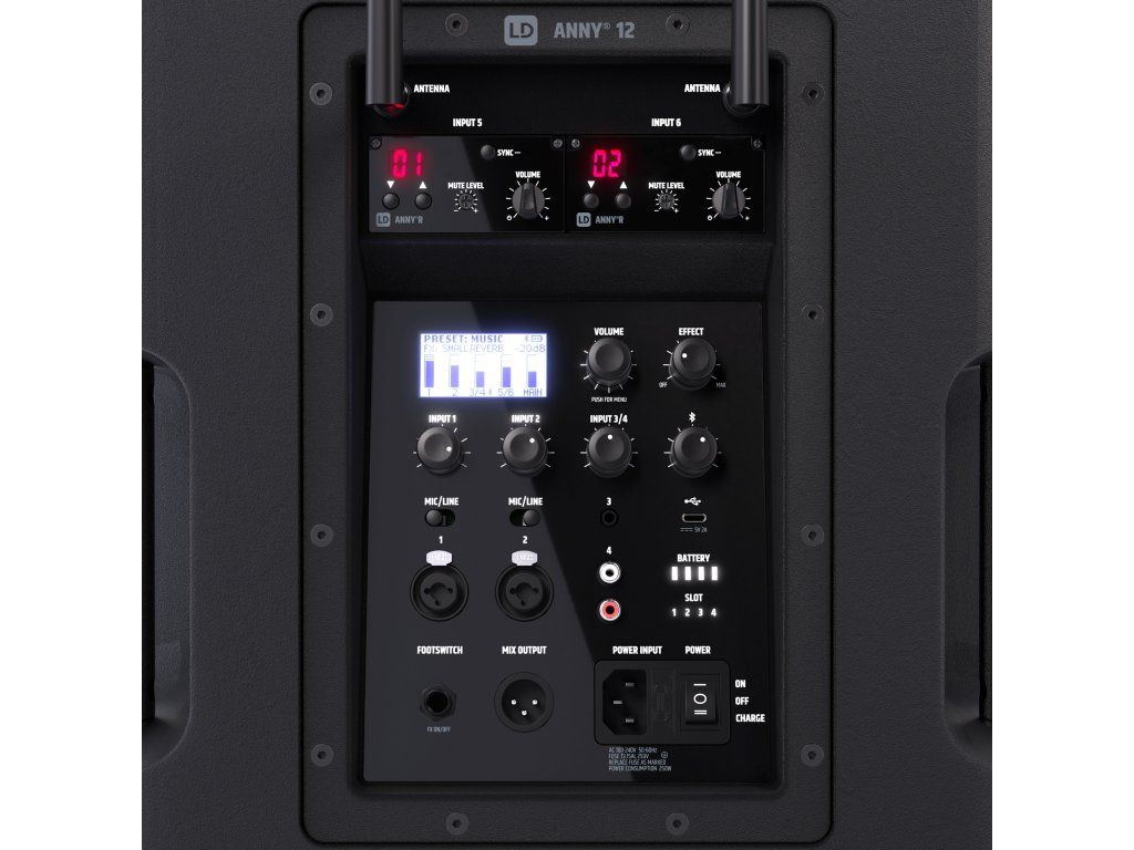 Integrovaný 6-kanálový mixážní pult, 3-pásmový ekvalizér, 5 předvoleb pro různé aplikace (MUSIC, LIVE, VOCAL, ECO, FLAT) a efekty jako reverb a delay - tento reproduktor je skvělou kombinací komplexních funkcí a vynikající kvality zvuku v kompaktním a robustním provedení. ANNY 12 zaujme svými všestrannými možnostmi připojení: dvěma combo vstupy pro mikrofon/linku, jedním stereo kanálem s 3,5mm jackem (AUX) a RCA vstupy, a také Bluetooth 5.0 s kodekem AAC. Mobilní telefony nebo tablety lze nabíjet přes port USB-C na zadní straně zařízení ANNY, takže jsou vždy připraveny k použití.
