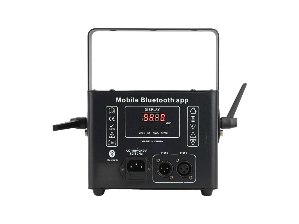 V zadní části zařízení je instalována napájecí zásuvka IEC a také 3pinový vstup a výstup XLR, které umožňují ovládání jednotky pomocí DMX signálů. Díky nim můžeme laserové projektory propojit pomocí DMX kabelů a vytvořit poutavou laserovou show. Na zadní straně projektoru se nachází také ovládací panel zařízení. Ten se skládá z přehledného LCD displeje a 4 tlačítek, díky kterým se lze pohybovat v menu a volit požadované parametry provozu jednotky.