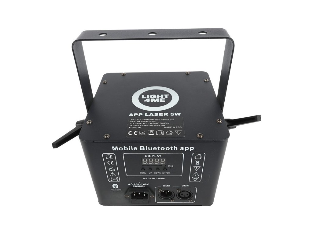 LIGHT4ME APP LASER 5W RGB je vysoce kvalitní, profesionální pódiový světelný efekt v podobě animačního laseru, který je vybaven vstupem a výstupem DMX a možností ovládání přes Bluetooth pomocí aplikace v mobilním zařízení. Laserový projektor vyzařuje paprsky o celkovém výkonu až 5 wattů v červené, zelené a modré barvě (RGB), čímž vytváří spektakulární, barevnou laserovou show. Díky vestavěným dynamickým efektům, vzorům a animacím, a také možnostem ručního kreslení vzorů, výběru textu animace, vytváření a úpravy scén přímo z aplikace Bluetooth, se skvěle hodí do divadel, na profesionální hudební pódia, diskotéky i pro mobilní práci DJů.