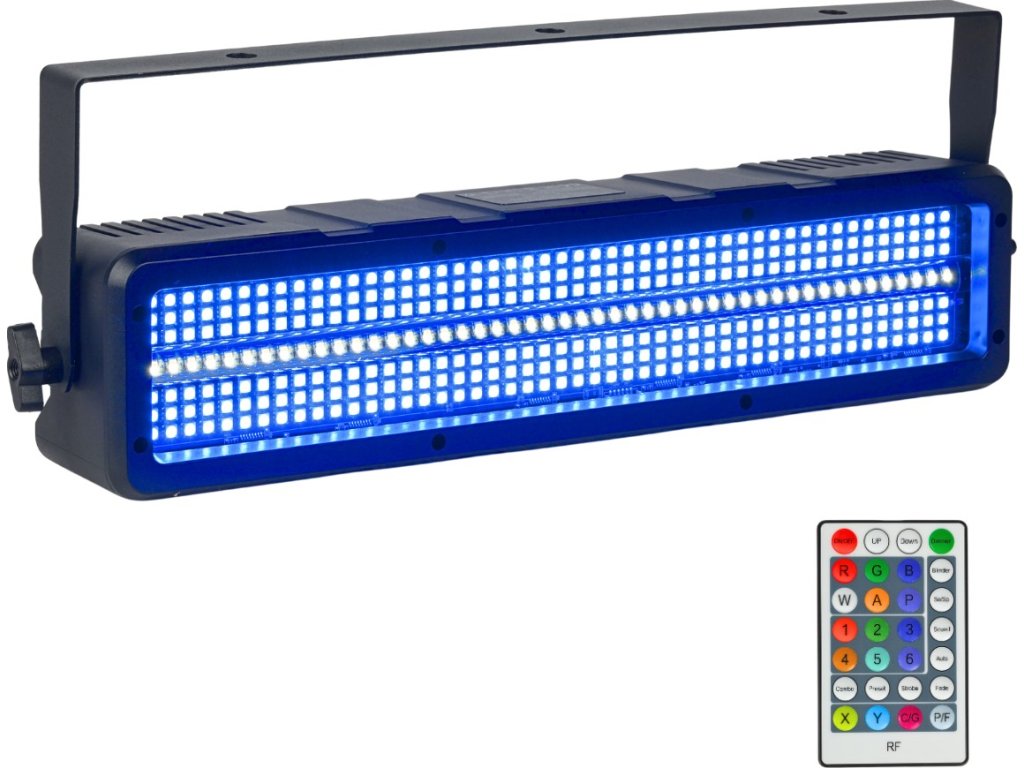 - Typ zařízení: jevištní stroboskop s bezdrátovým ovladačem a montážní konzolí- Světelný zdroj: 48x1W CW/A SMD3030 LED 2v1 + 288x0,2W RGB SMD5050 LED 3v1