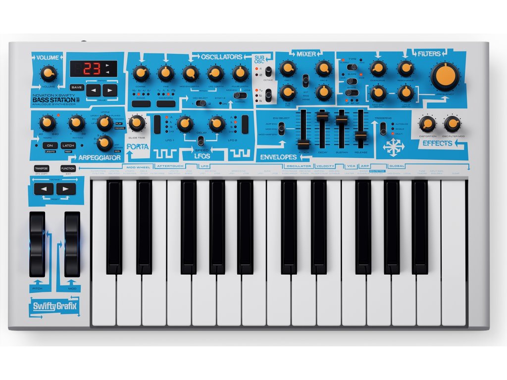 NOVATION Bass Station II Swifty Edition je limitovaná edice ikonického analogového syntezátoru, vytvořená ve spolupráci s renomovaným grafickým umělcem Swiftym. Tato verze přináší nejen jedinečný vizuální styl, ale především robustní analogový zvuk pro neomezenou hudební tvorbu.