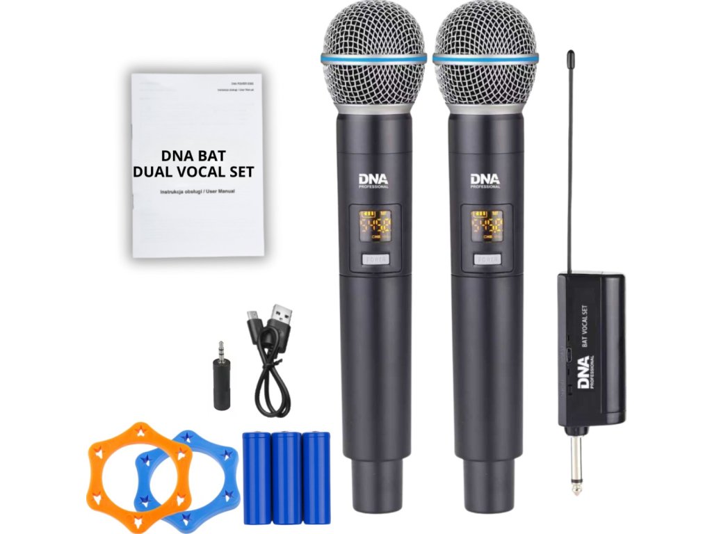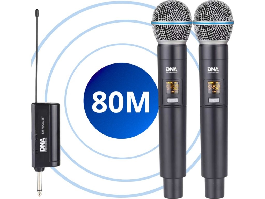 Hledáte spolehlivý systém pro živá vystoupení, karaoke nebo moderování akcí DNA Bat Dual Vocal Set je bezdrátový UHF set složený ze dvou ručních mikrofonů a plug-in přijímače, který zajišťuje čistý a stabilní zvuk na pódiu, v konferenčním sále i doma Díky frekvenci UHF 518–542 MHz a 2x48 kanálům získáte jistotu provozu bez rušení, a to i v náročných podmínkách. Je to ideální řešení pro zpěváky, DJ, učitele nebo moderátory akcí.