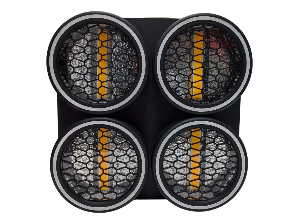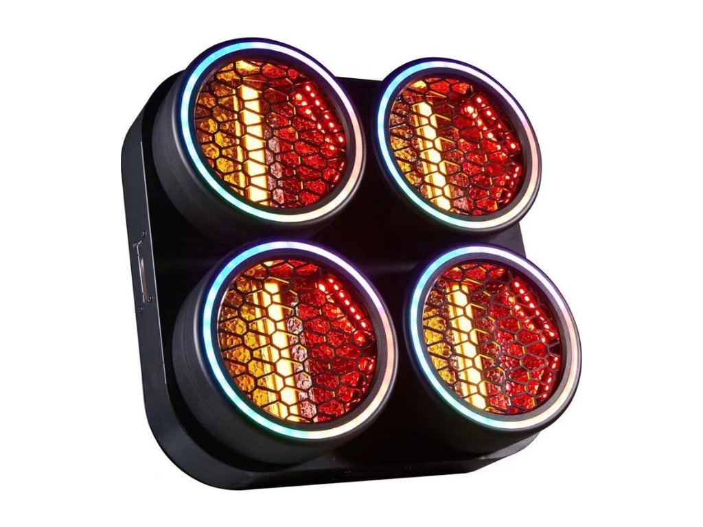 Light4Me Blinder Led 4 Ring je plně profesionální pódiový reflektor se čtyřmi 30wattovými LED diodami typu COB, které vyzařují teplé bílé světlo. Dále disponuje 124 LED diodami RGB (každá o výkonu 0,2 W) tvořícími ring efekt a 128 LED diodami RGB (každá o výkonu 0,2 W) vytvářejícími efekt pozadí. Reflektor umožňuje vytvořit úžasnou atmosféru během různých typů akcí, nasvítit scénu a také dosáhnout stroboskopických efektů. Je nepostradatelným pracovním nástrojem pro osvětlovače na koncertech, při vystoupeních v kulturních domech, střediscích volného času, divadlech, tanečních klubech a diskotékách, stejně jako pro mobilní DJe a eventové kapely. Pokud potřebujete intenzivně osvětlit scénu, taneční parket nebo jakýkoliv interiér, Light4Me Blinder Led 4 Ring je rozhodně reflektor pro vás.