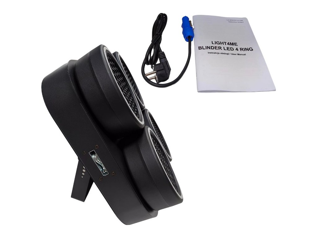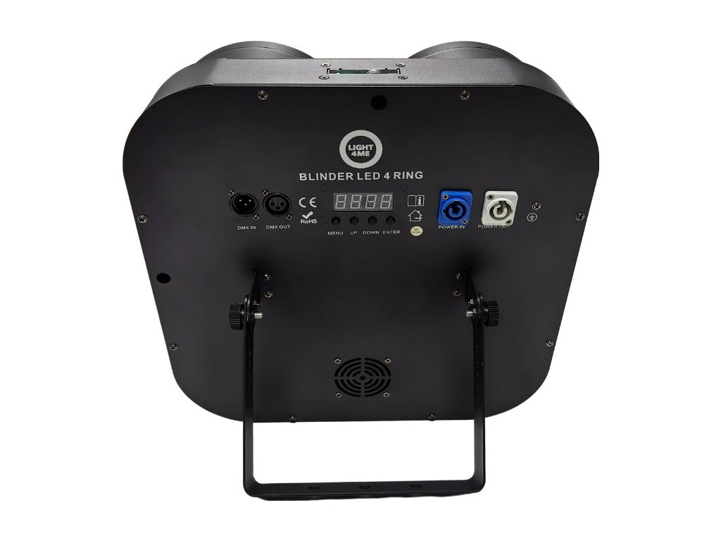 Light4Me Blinder Led 4 Ring má robustní kovové pouzdro a díky přiloženému montážnímu držáku může být blinder umístěn na zemi pod vhodným úhlem vzhledem k osvětlované ploše. V případě potřeby osvětlení shora jej lze také nainstalovat na konstrukce (trussy) a světelné rampy. Na zadní straně zařízení se nacházejí napájecí konektory typu powercon (včetně výstupu powercon „link“ umožňujícího předávání napájení přímo ze zařízení do zařízení), 3pinové zásuvky XLR sloužící k ovládání reflektoru pomocí protokolu DMX a intuitivní ovládací panel skládající se z displeje a 4 tlačítek. Můžete snadno zvolit jeden ze 3 provozních režimů zařízení: