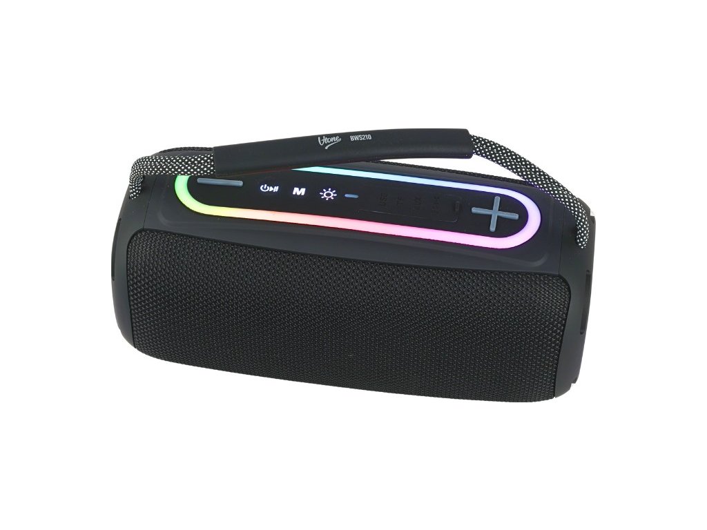 V-TONE BWS210 BK je vynikající reproduktor jak do domácnosti, tak pro venkovní party. Elegantní černé tělo s pohodlným madlem a stylovou přední částí doplňují intuitivní ovládací tlačítka, která slouží k nastavení hlasitosti, výběru provozního režimu zařízení a ovládání RGB podsvícení. Zařízení disponuje výkonem 20 wattů (2x10W) a vestavěný akumulátor s kapacitou 2400 mAh umožňuje nepřetržitý provoz po dobu několika až dvanácti hodin. Bluetooth má dosah přibližně 10 metrů, takže s V-TONE BWS210 BK můžete poslouchat hudbu i z větší vzdálenosti bez obav ze ztráty spojení.