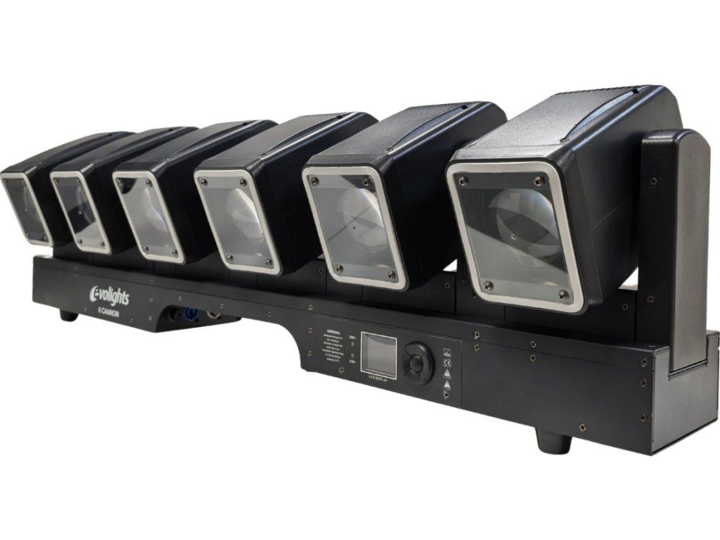 Evolights 6 Cannon – světelná lišta se 6 otočnými hlavami typu beam + ring efekt pro profesionální pódia a kluby