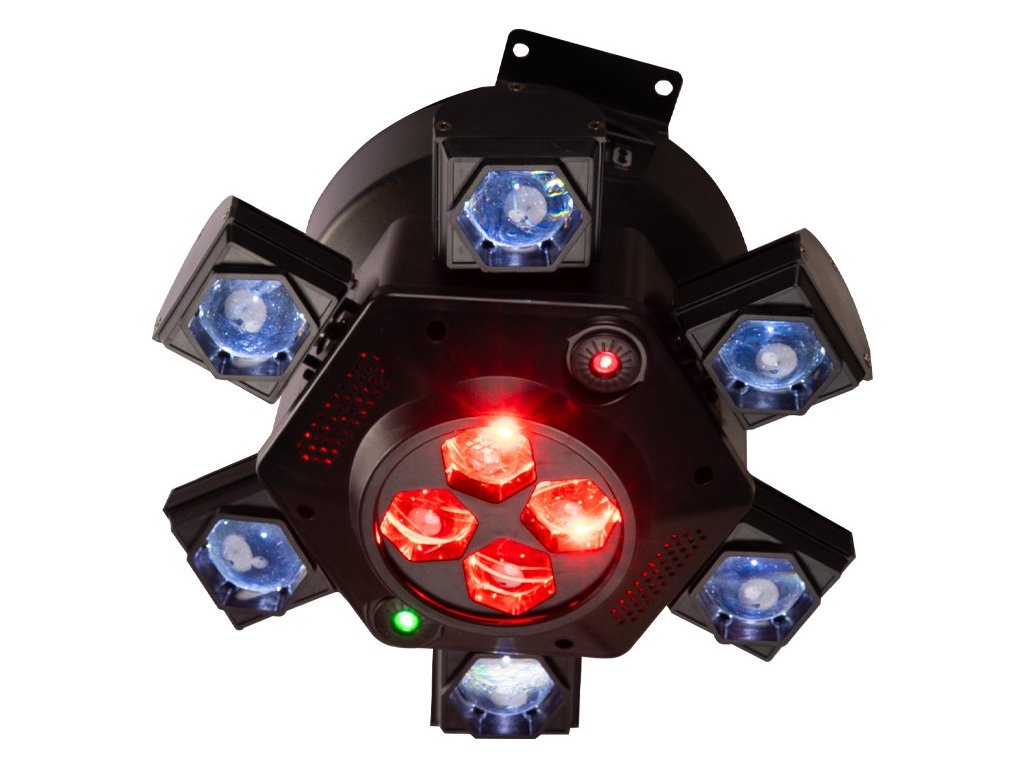 CenterDroid je světelný efekt s obrovským dopadem, navržený tak, aby zaplnil celou místnost pohybem, barvami a čistou energií. Představte si, jak tento centrální prvek okamžitě oživí vaši stage – kombinuje totiž výkonné RGBW LED zdroje s precizními červenými a zelenými laserovými paprsky. CenterDroid vytváří úžasné vrstvené vizuální efekty, které se šíří od samotného zařízení přímo do vzduchu a po celém tanečním parketu. Deset vysoce výkonných 15W CREE RGBW LED diod zajišťuje bohaté míchání barev, plynulé přechody a odvážné paprskové efekty, zatímco integrované lasery generují ostré vzdušné vzory a dynamické projekce, které dodají vaší show hloubku a tu správnou atmosféru.