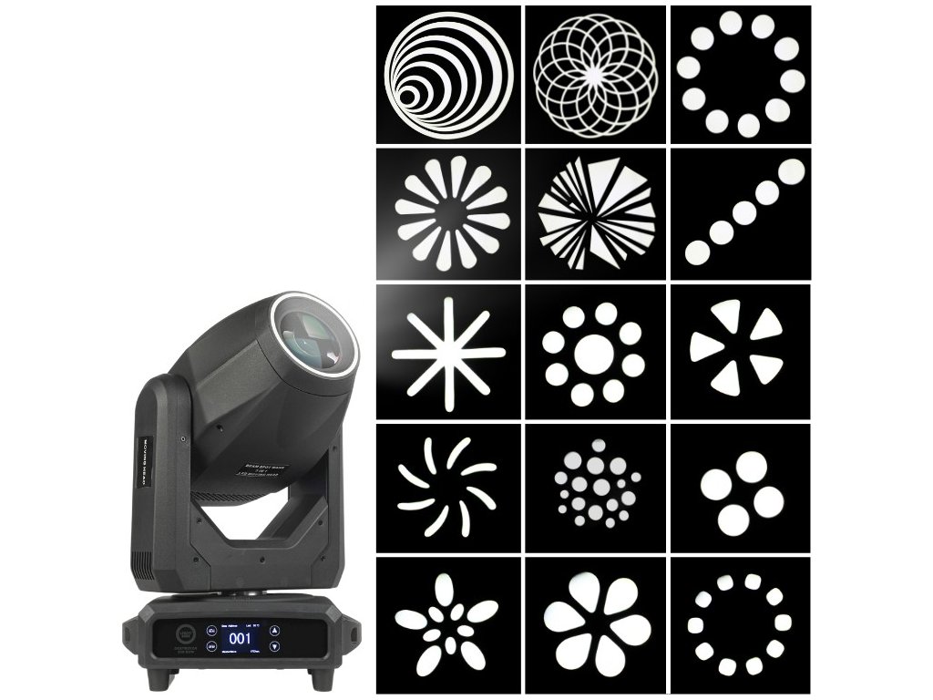 - Kotouč statických gobo: 9 vzorů + open, Gobo Shake, obousměrný Gobo Scroll