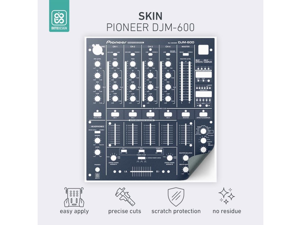 Nalepovací skiny Doto Design jsou perfektní pro přizpůsobení vzhledu vašeho DJ vybavení (mixážní pulty, gramofony, přehrávače, kontrolery). Na výběr je velké množství barev a exkluzivních vzorů pro vytvoření jedinečného vzhledu. Skiny jsou precizně vyrobeny z prémiových materiálů, mají matný antireflexní povrch a ochrání vaše vybavení před poškrábáním a opotřebením. Díky nové adhezivní vrstvě je aplikace velmi jednoduchá a v případě sundání skinu nezůstanou na technice žádné stopy nebo zbytky lepidla.