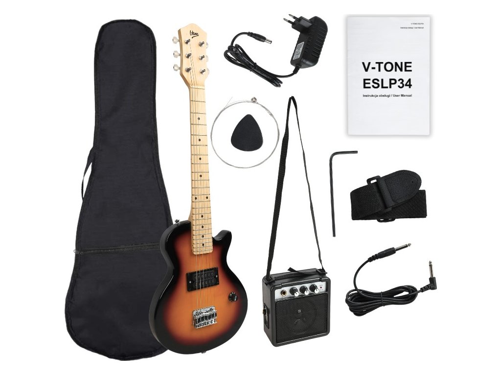 V-TONE ESLP34 SB je kompletní kytarový set pro začátečníky a středně pokročilé kytaristy, kteří ocení úžasný, zvučný hlas elektrických kytar a chtějí začít své dobrodružství s tímto nástrojem. Díky V-TONE ESLP34 SB nemusíte samostatně kupovat kytaru, snímače, zesilovač, kabely, popruh, trsátko, náhradní strunu, imbusový klíč nebo obal – nyní vše obdržíte v jednom kompletním balení.