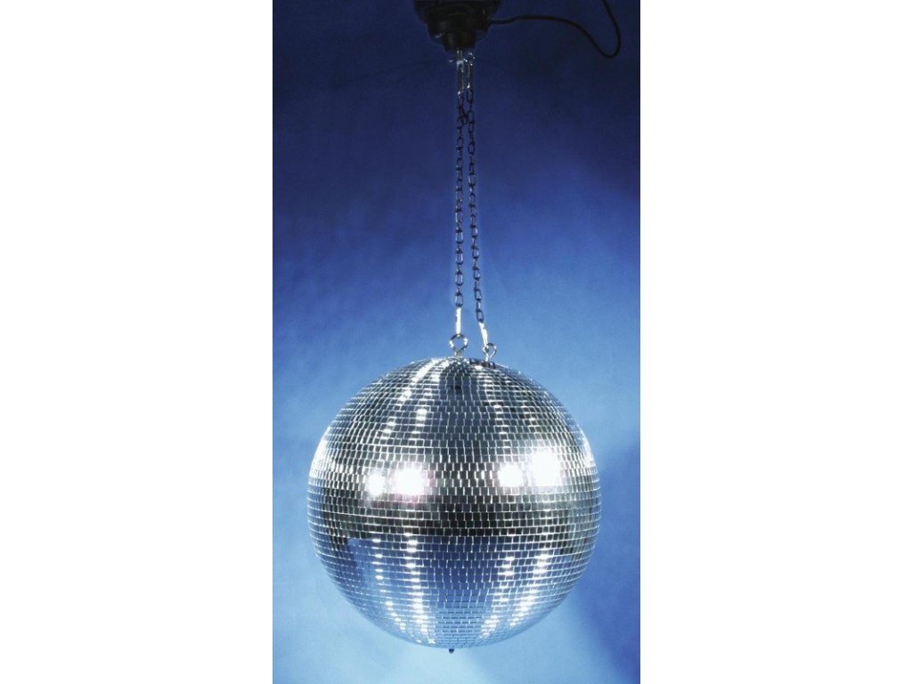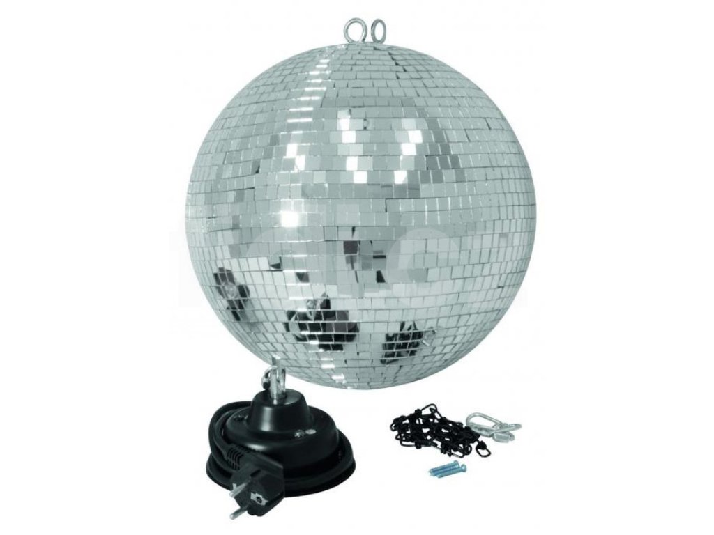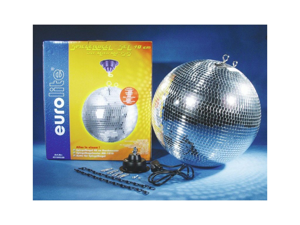 Sady obsahují zrcadlovou kouli v různých průměrech, motorek 1,5 otáčky/min. řetěz k upevnění koule. Ideální dekorace pro noční kluby, bary a restaurace.