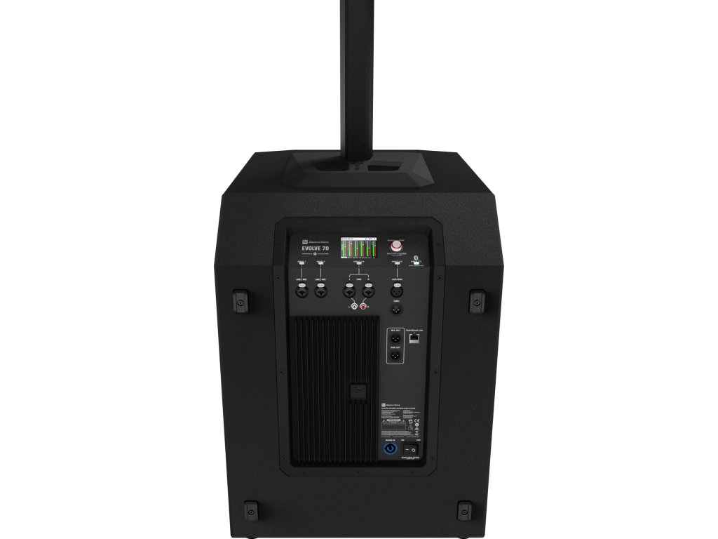 EVOLVE 70, který je k dispozici v černé nebo bílé barvě, vylepšuje design řady EVOLVE a spoléhá se na lehké materiály a ergonomické designové principy, aby zajistil maximální přenosnost a známý nápadný vzhled. Hliníková distanční tyč odděluje horní reproduktorové sloupky od subwooferů, zatímco neodymové měniče a pokročilé materiály udržují nízkou hmotnost. Přiložené přepravní pouzdro pro sloupek a distanční tyč v kombinaci s volitelným transportním vozíkem zajišťují, že si EVOLVE udržuje svou skvělou reputaci v oblasti přenositelnosti.