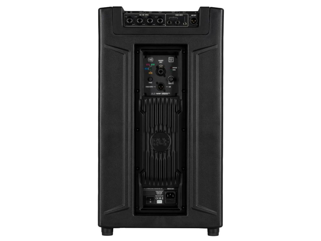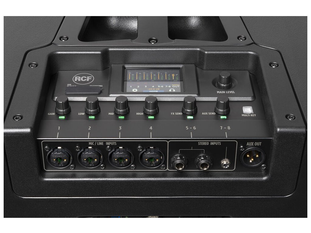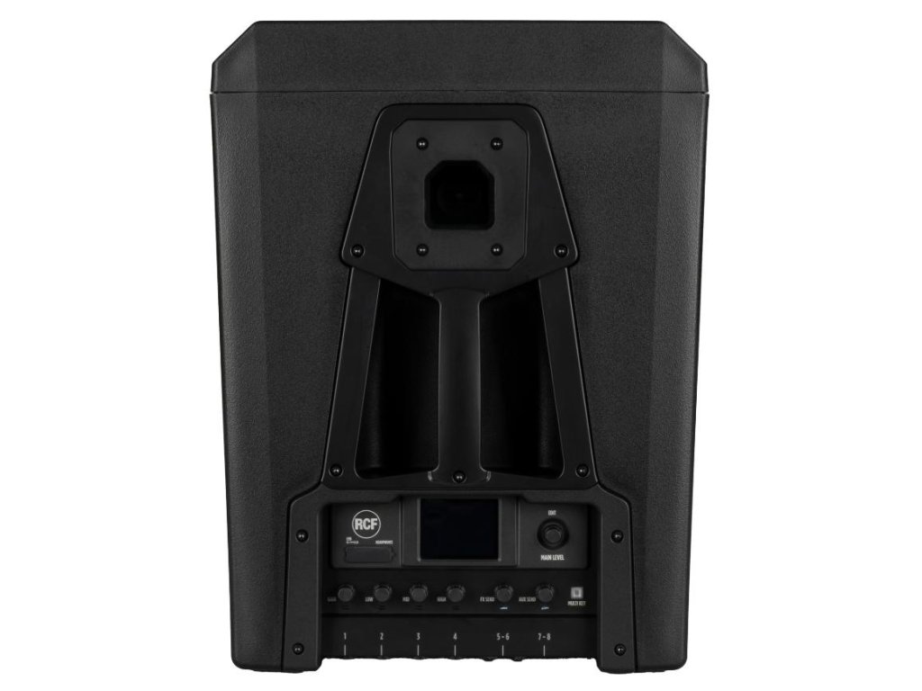 Neodymový kompresní driver (1,75" v.c., Kapton kopule) s vlnovodem True Resistive Waveguide (TRW) pro bezrezonanční zatížení a konstantní pokrytí 120° x 40°. Přední vyzařování soustavy 6x 3" neodymových měničů v kombinaci s centrovaným vlnovodem zajišťuje vyváženou odezvu bodového zdroje. 12" woofer RCF poskytuje hluboké, kontrolované nízké frekvence, ideální pro hudbu s výraznými basy a energická vystoupení.