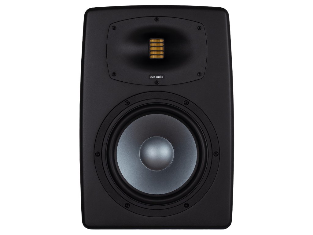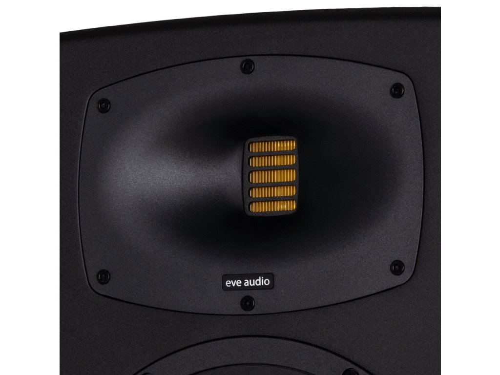 - Přední vícebarevné logo „eve audio“ poskytuje okamžitou vizuální zpětnou vazbu o stavu systému, signalizuje clipping, zobrazuje průběh aktualizace firmwaru a další provozní stavy