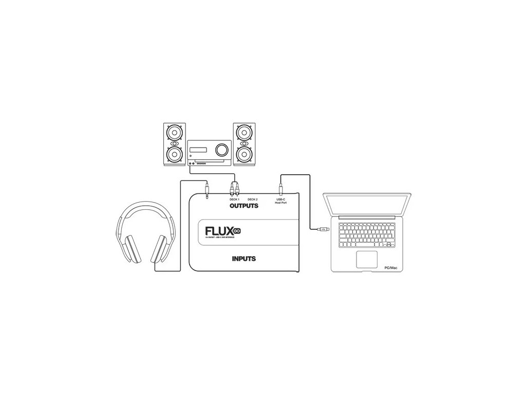 Díky 4×4 In/Out audio rozhraní s duálními stereo vstupy a výstupy lze Flux Go snadno integrovat do široké škály DJ setupů. Vstupy jsou pomocí DIP přepínačů individuálně přepínatelné mezi Phono a Line, takže bez problémů připojíte gramofony, CD přehrávače nebo jiné přehrávače. Praktická zemnící svorka zajišťuje čistý signál při použití vinylových zdrojů a umožňuje proměnit jakýkoliv DJ mixér v plnohodnotný DVS systém s minimálním technickým úsilím.