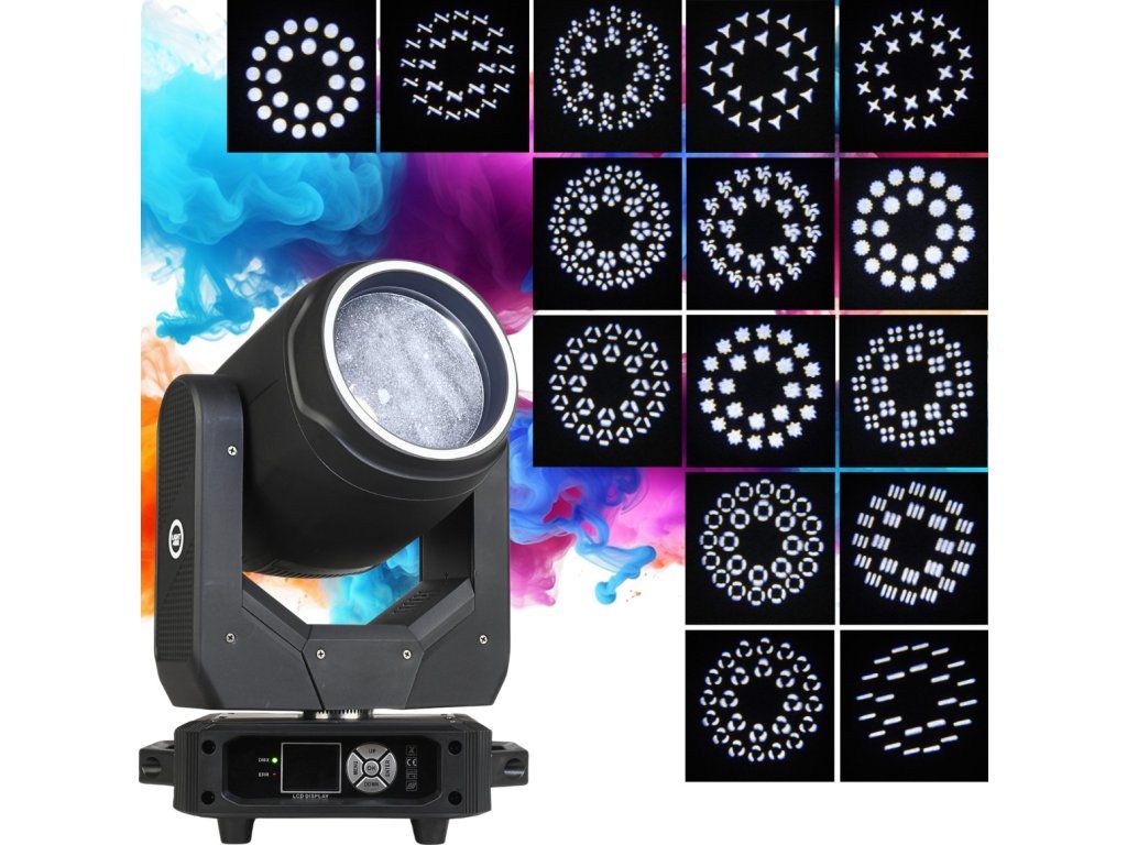 Efekt ring nabízí až 10 hotových maker a režimy jako Color Jump, Color Gradient nebo náhodný program. V kombinaci s 13 barvami, 14 polobarvami a kotoučem statických gobo (17 vzorů) získáte nekonečné možnosti vytváření unikátních světelných aranžmá. K tomu se přidává rotační 8+16stěnný hranol (prisma), duhový efekt a frost filtr – ideální kombinace pro tvůrce představení, koncertů a módních přehlídek.