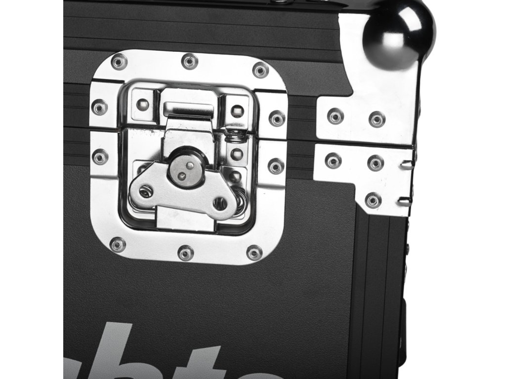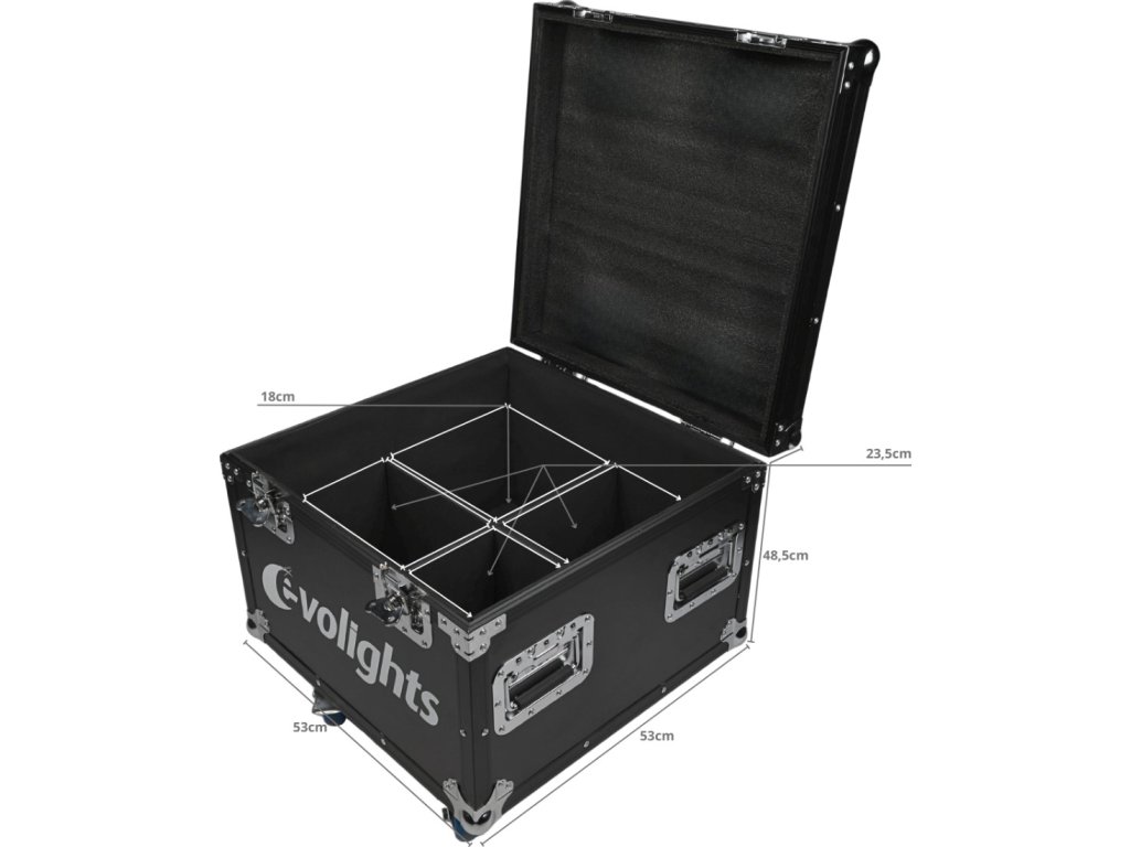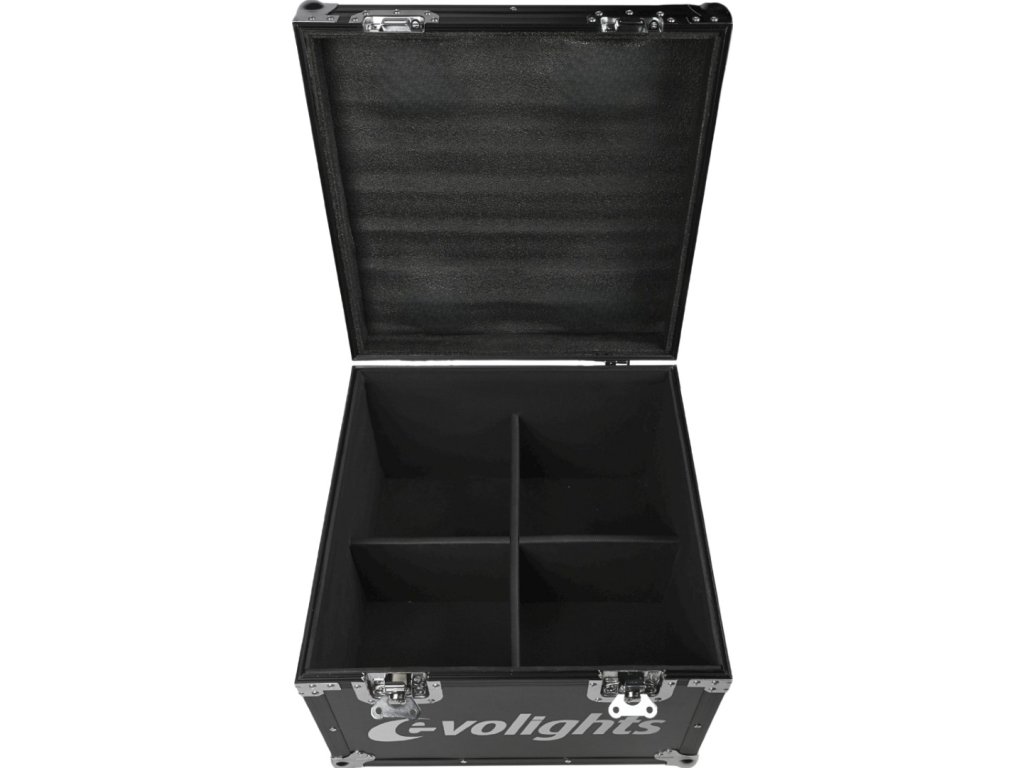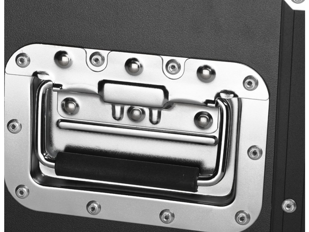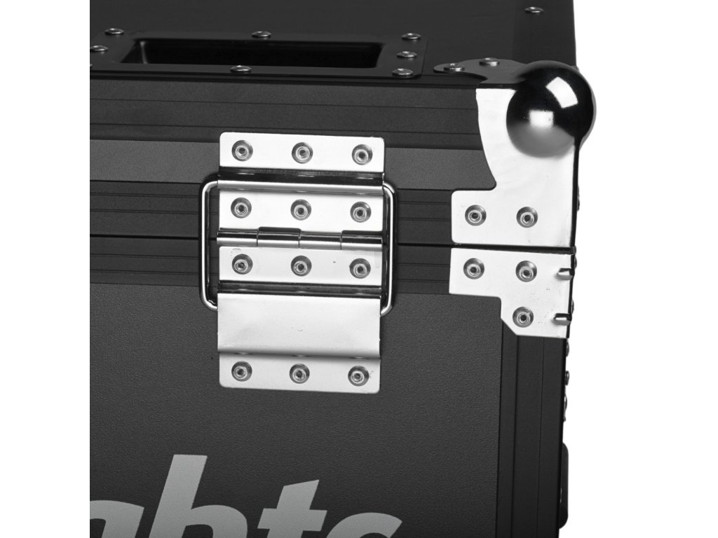 Víko je proti nechtěnému otevření zajištěno dvěma robustními motýlkovými zámky a otevírá se jednostranně do svislé polohy. Díky správnému úhlu náklonu nepadá zpět na uživatele, což zajišťuje snadný a pohodlný přístup k uložené technice. Uvnitř se nacházejí čtyři komory dokonale přizpůsobené pódiovým PAR reflektorům. Vnitřek case je vystlán měkkou technickou pěnou, která skvěle chrání uložené vybavení před poškozením. Na každém boku kufru jsou dvě pohodlná madla pro snadnou manipulaci a na spodní straně čtyři otočná kolečka, z nichž dvě jsou vybavena brzdou.
