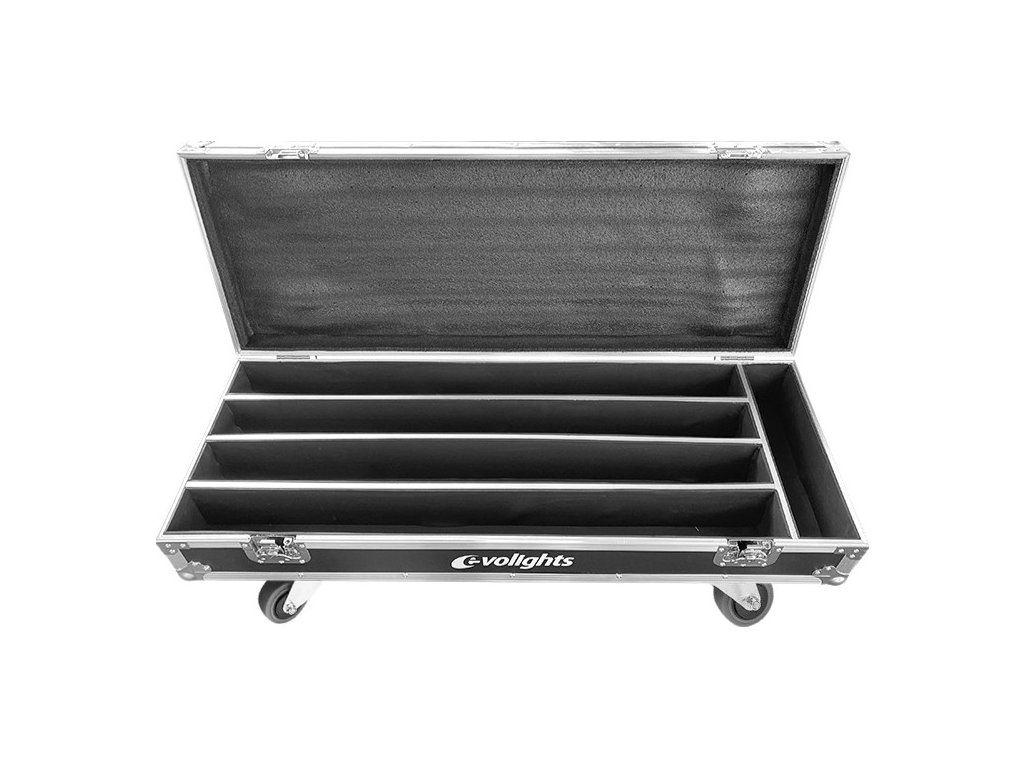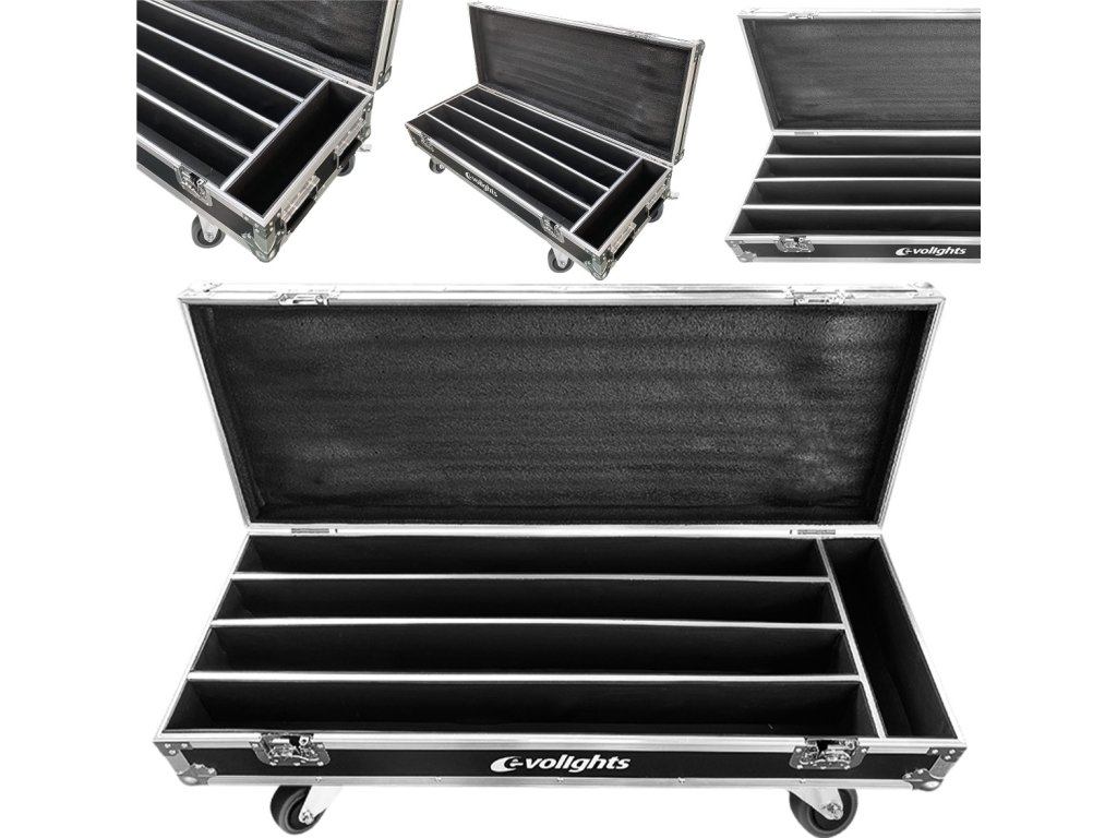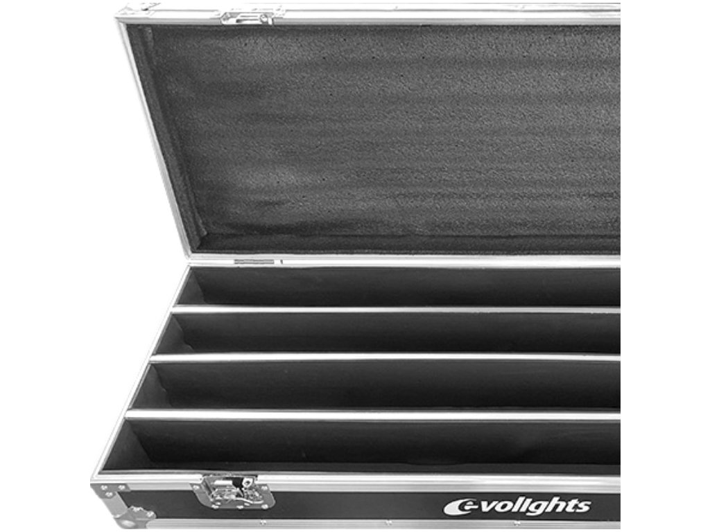 Evolights Glaze Bar Case 4in1 je profesionální a velmi robustní přepravní kufr pro 4 světelné lišty Glaze Bar nebo jiná zařízení podobných rozměrů. Case je vyroben ze silné, 7mm překližky lakované speciální voděodolnou barvou. Jeho hrany jsou vyztuženy hliníkovými profily. Na rozích se nacházejí kulové chromované kryty, které dodatečně zpevňují konstrukci a chrání okolí kufru díky eliminaci ostrých hran.