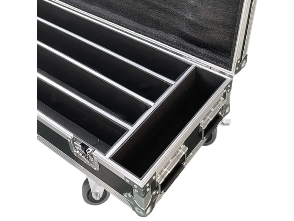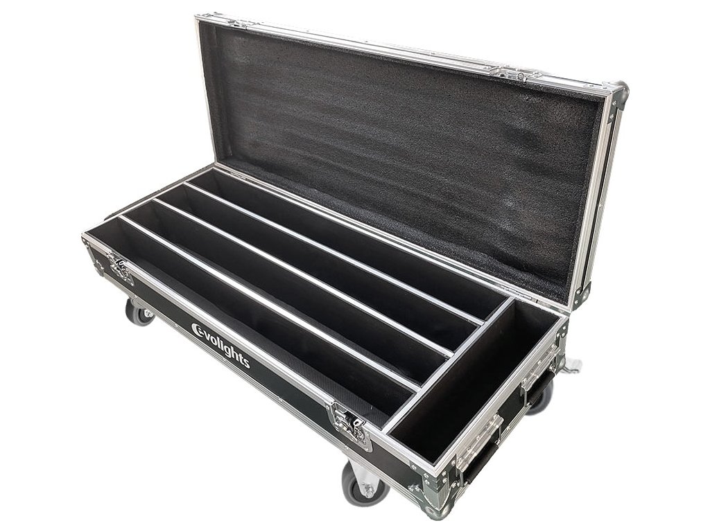 Evolights představuje kvalitu, uživatelský komfort a konkurenceschopnou cenu. To samé platí i pro tento přepravní case Glaze Bar Case 4in1. Jeho víko je proti nechtěnému otevření zajištěno dvěma pevnými motýlkovými zámky. Otevírá se jednostranně do svislé polohy a díky vhodnému úhlu vyklopení nepadá na uživatele, což zajišťuje snadný a pohodlný přístup k uložené technice. Uvnitř najdete čtyři přihrádky dokonale přizpůsobené světelným lištám a oddíl pro kabeláž a další příslušenství. Vnitřek casu je vystlán měkkou technickou pěnou, která dokonale chrání uložené vybavení před poškozením. Na každé straně kufru jsou dvě pohodlná madla umožňující snadné přenášení a na spodní straně čtyři otočná kolečka, z toho dvě s brzdou. Glaze Bar Case 4in1 je přepravní kufr vyrobený na míru pro světelné lišty Glaze Bar značky Evolights.