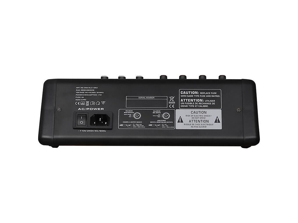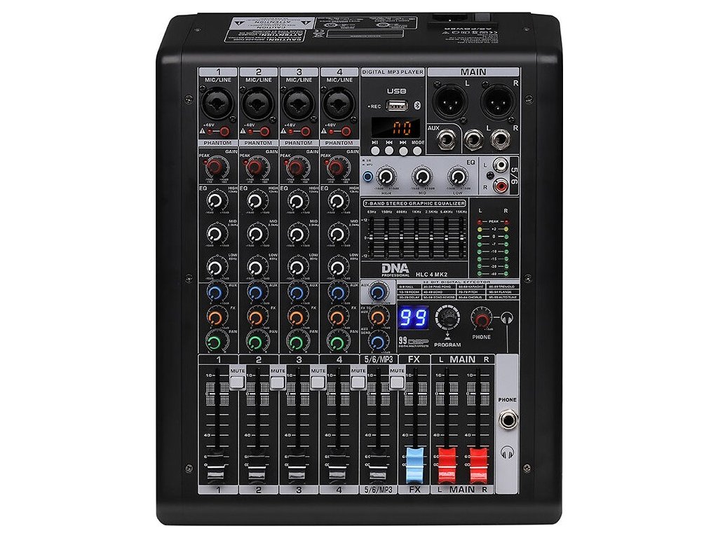 Každý ze čtyř kanálů audio konzole disponuje symetrickým vstupem MIC/LINE určeným pro signál s vysokou impedancí a přepínačem phantomového napájení +48V. Ke každému ze vstupů lze připojit mikrofon, ale také gramofon, DJ konzoli nebo např. klávesový nástroj. Na úrovni jednotlivého kanálu můžeme ovládat parametry jako úroveň zesílení signálu (Gain), rozsah frekvencí vysokých, středních a basových tónů, ovládat úroveň efektů, izolovat nebo ztlumit jednotlivý kanál (Mute), nastavit úroveň signálu AUX a také panovat zvuk mezi levým a pravým kanálem hlavního výstupu. Díky pohodlným tahovým potenciometrům (faderům) snadno nastavíte požadovanou úroveň hlasitosti a případné přebuzení (clipping) bude rychle signalizováno červenou LED diodou. Hlavní sekce mixážního pultu umožňuje připojení externího rekordéru nebo přehrávače ke konzoli, přivedení zpětného signálu z externích zařízení a také ovládání vestavěného digitálního procesoru s 99 multiefekty. 7pásmový grafický ekvalizér umožňuje vyladit požadovanou barvu mixu, kterou můžete přesně monitorovat pomocí sluchátek. Další výhodou DNA HLC 4 MK2 je také funkce kontroly úrovně FX TO AUX.