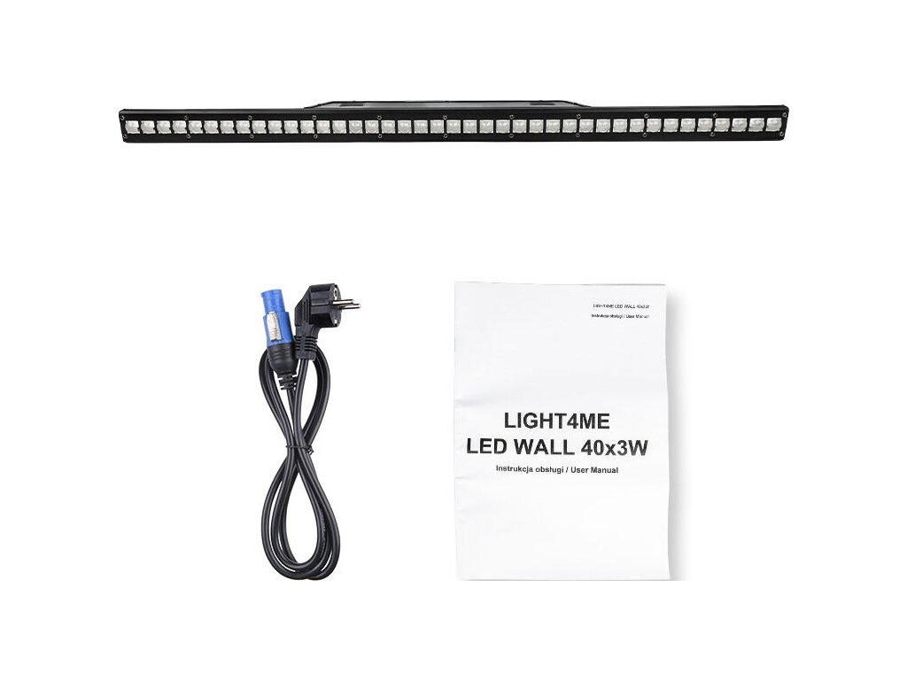 LIGHT4ME LED WALL 40x3W RGB je moderní osvětlovací lišta, která se ideálně hodí pro světelné dekorace i jako scénické osvětlení. Díky použití 40 RGB LED diod 3535 o výkonu 3 W každá poskytuje silné světlo a širokou paletu barev, které umožňují vytvářet neobvyklé světelné efekty. Toto osvětlovací zařízení nabízí stmívač v plném rozsahu (dimmer), což umožňuje přesnou regulaci jasu světla. Navíc nastavitelná rychlost stroboskopu a dynamické barevné efekty, jako jsou Color Jump, Color Gradient, Color Pulse a efekty „dýchání“ světla, zajistí, že každá scéna získá jedinečný charakter.