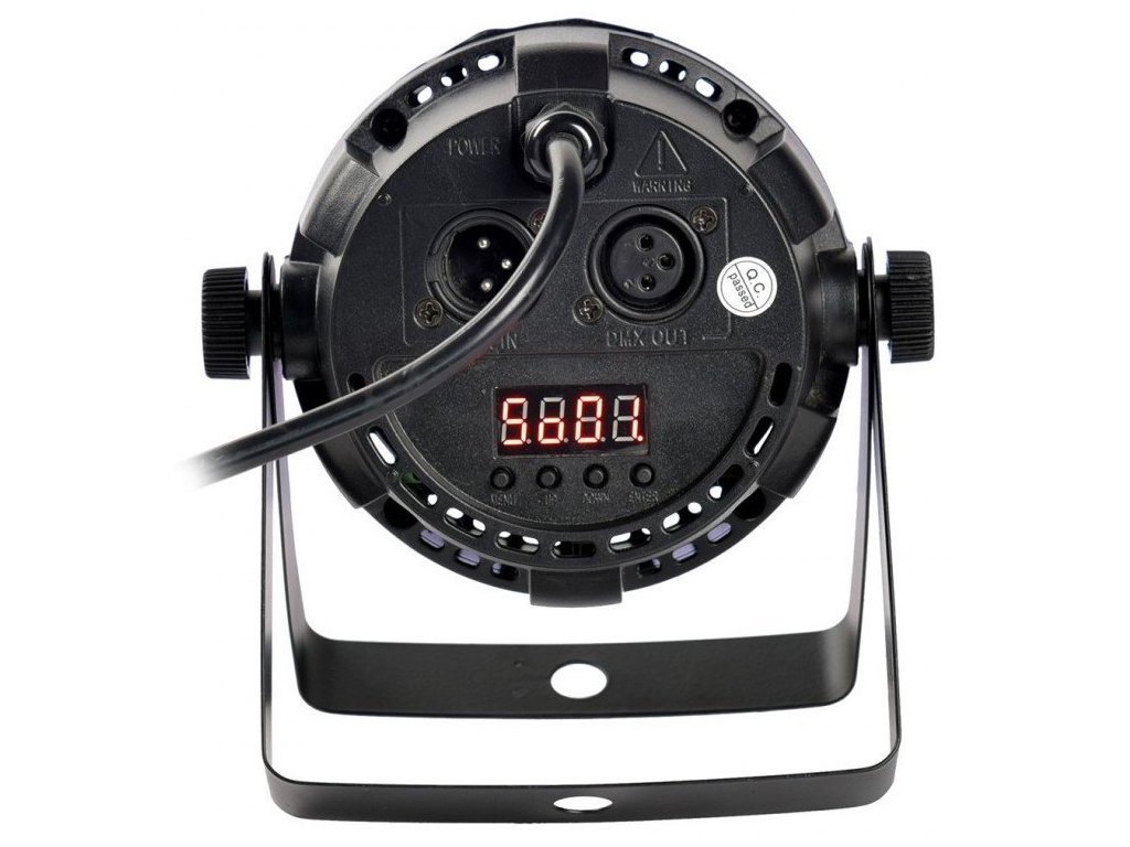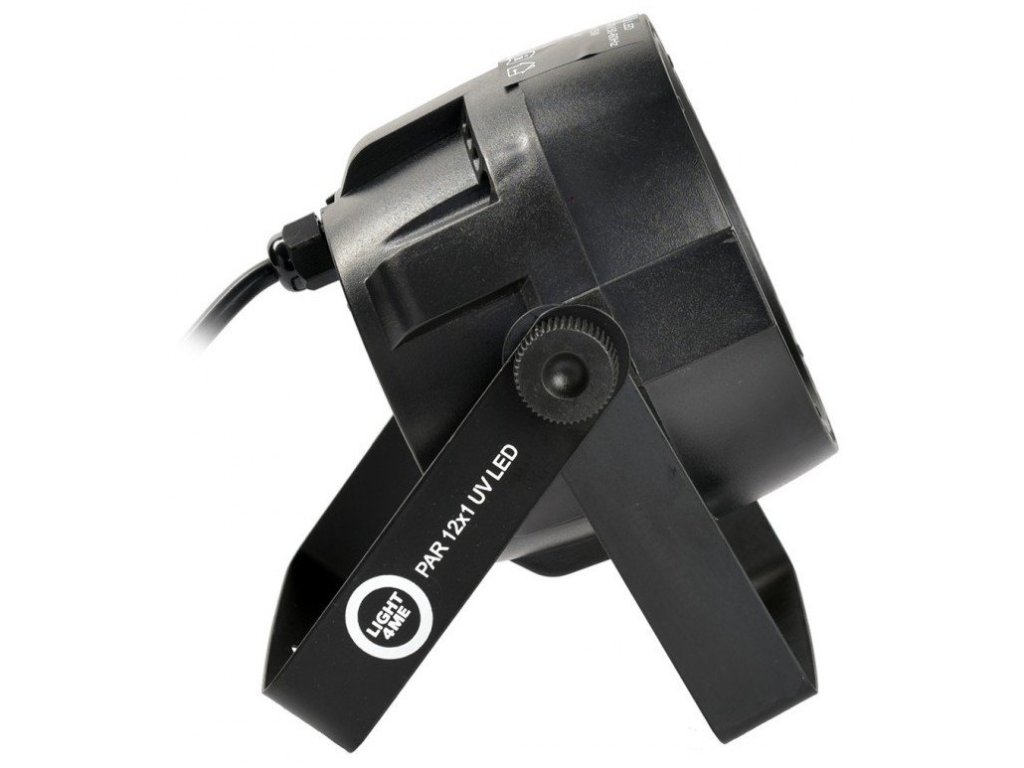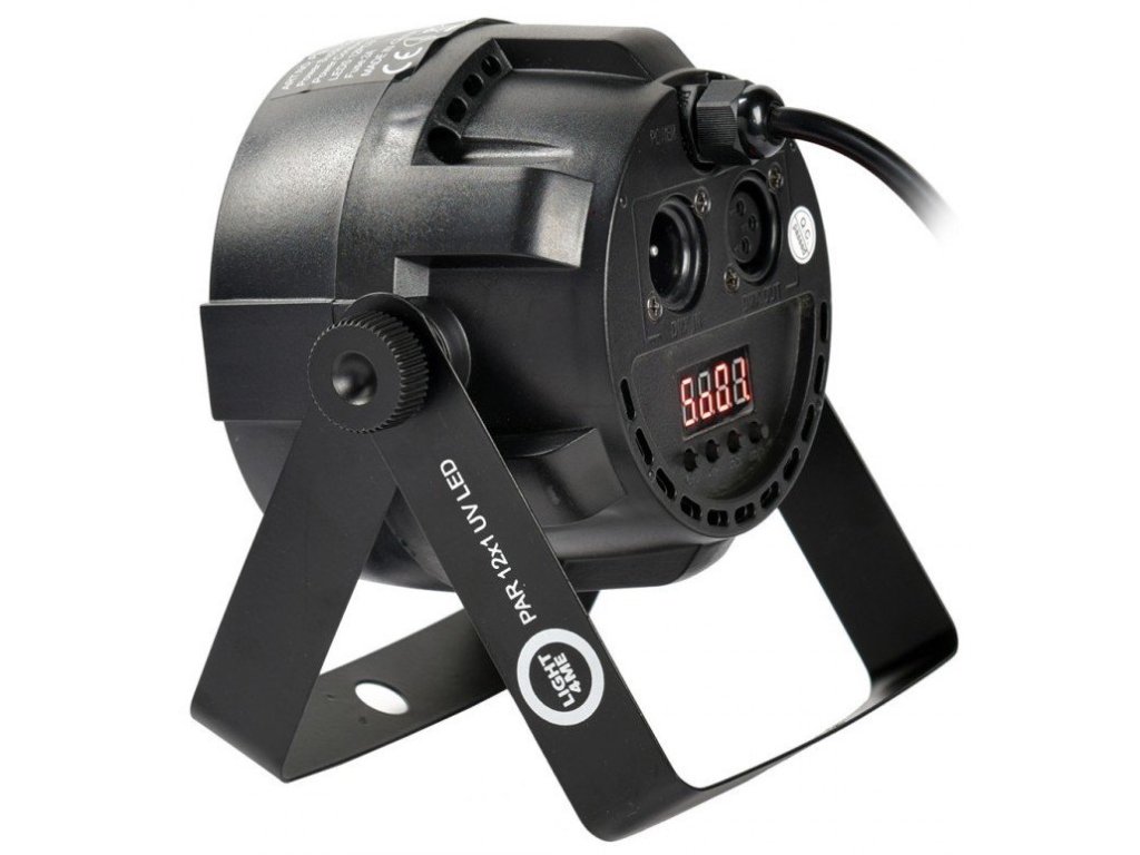 Malý, lehký, snadno použitelný LED PAR LED reflektor vybavený 12 výkonnými, 1 W UV LED diodami. Zadní strana reflektoru má XLR patice pro odesílání DMX signálů a ovládací panel ve formě digitálního displeje se čtyřmi tlačítky.