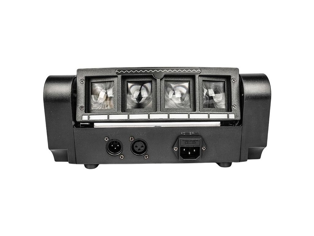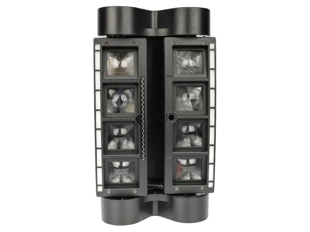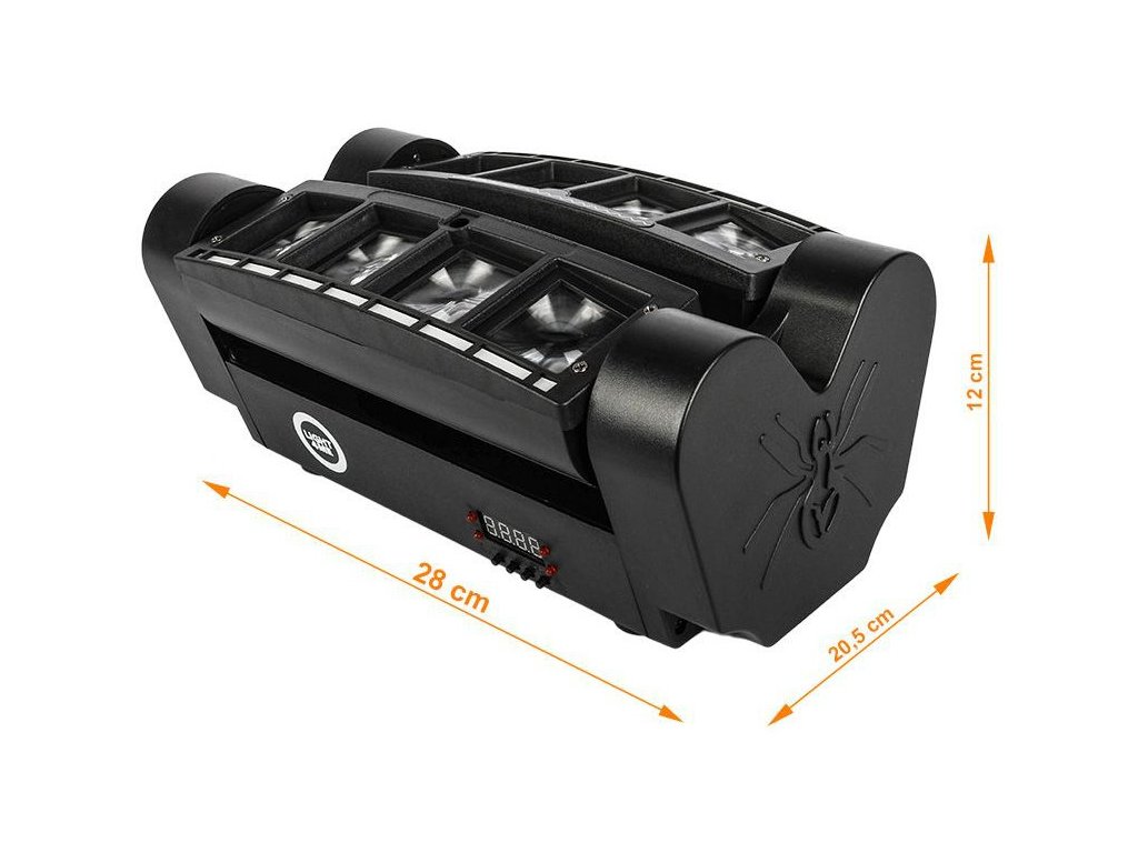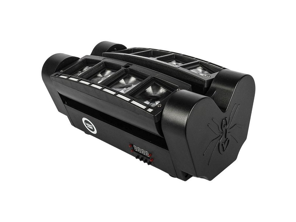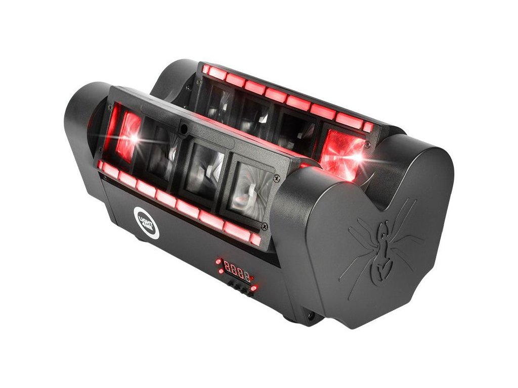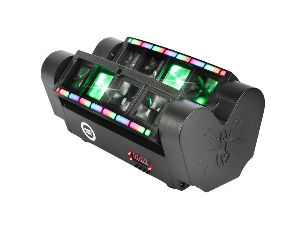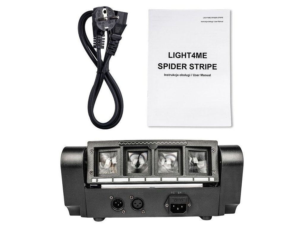 Spider Stripe je dokonalým osvětlením pro každou taneční párty. Zařízení je vybaveno dvěma paralelními LED bary, které se mohou pohybovat nezávisle na sobě nakláněním podél delší osy. Každý bar obsahuje 4x 3W LED diody vyzařující paprsky v barvách RGBW. Vnější okraje každého LED baru jsou vybaveny dalším systémem LED pásků. Dynamické světelné efekty zajišťuje také stroboskop s nastavitelnou rychlostí záblesků a více než 20 vestavěných efektů s regulací rychlosti činí paletu světelných možností tohoto dvojitého pohyblivého LED baru skutečně velmi širokou.