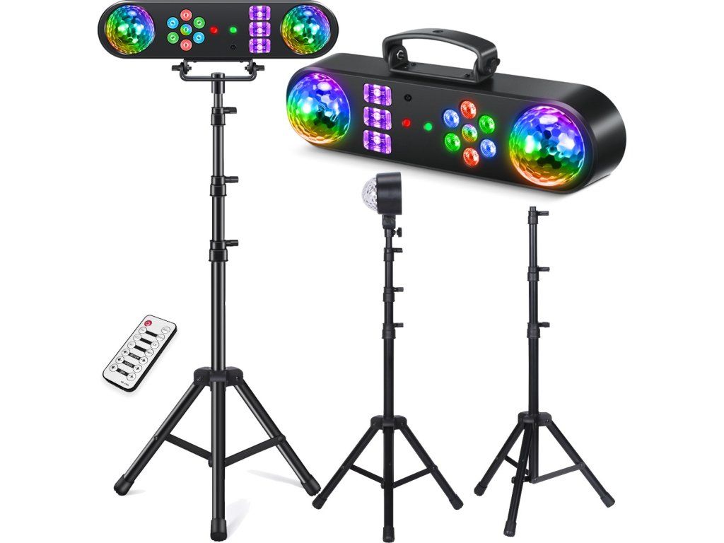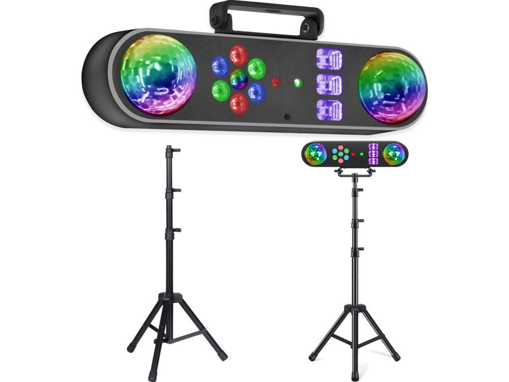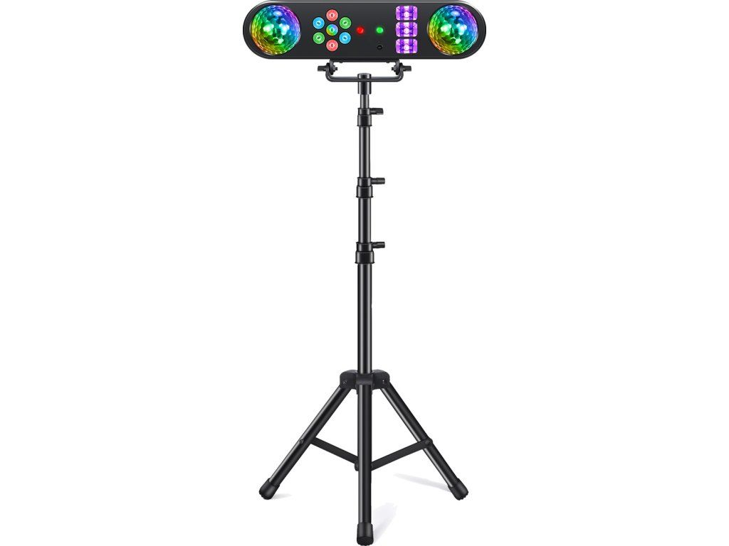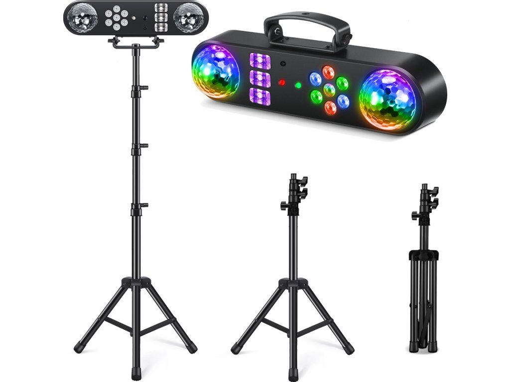 Tělo zařízení je vyrobeno z odolného plastu a ocelový stativ s práškovým nástřikem a nastavitelnou výškou zaručuje stabilitu a dlouhou životnost. Rozsah nastavení stativu od 56 do 165 cm umožňuje přizpůsobit umístění podmínkám prostoru bez ohledu na velikost místnosti. Stativ má po složení pouze 51 cm, takže přeprava a skladování světelného multiefektu i jeho stativu nebudou činit žádné potíže. Díky montážnímu držáku, který je součástí sady, můžete zařízení bezpečně upevnit na stativ a eliminovat tak riziko pádu přístroje během provozu.