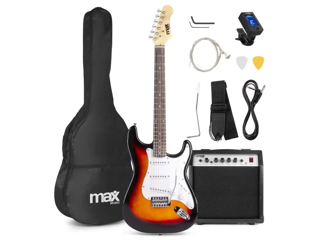 Výhodný set pro hudebníky, který se skládá z elektrické kytary s kombem MAX GigKit (sunburst) a stojanu na kytaru Max GP20.