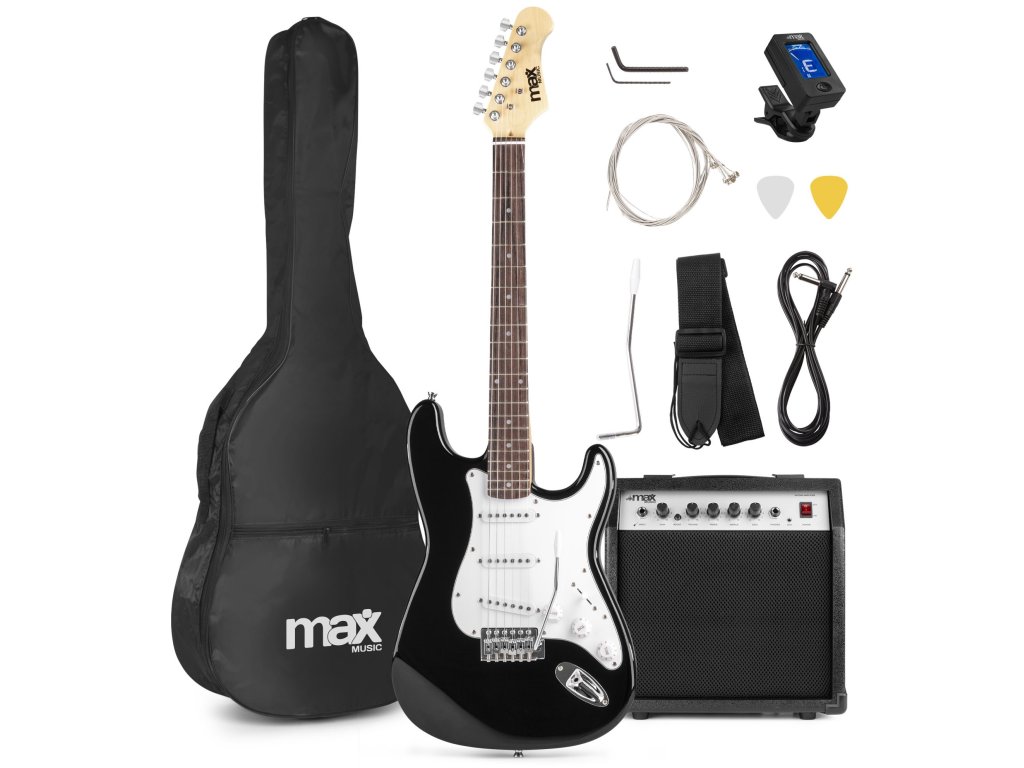 Elektrická kytara MAX GigKit je ideální pro začínajícího kytaristu. Tato kytara poskytuje kvalitní a čistý zvuk a je dodávána se vším příslušenství, které potřebujete. Zahrnuta v tomto balení je kytara, obal na kytaru, kytarové kombo, náhradní struny, ramenní popruh, trsátka a digitální ladičku.