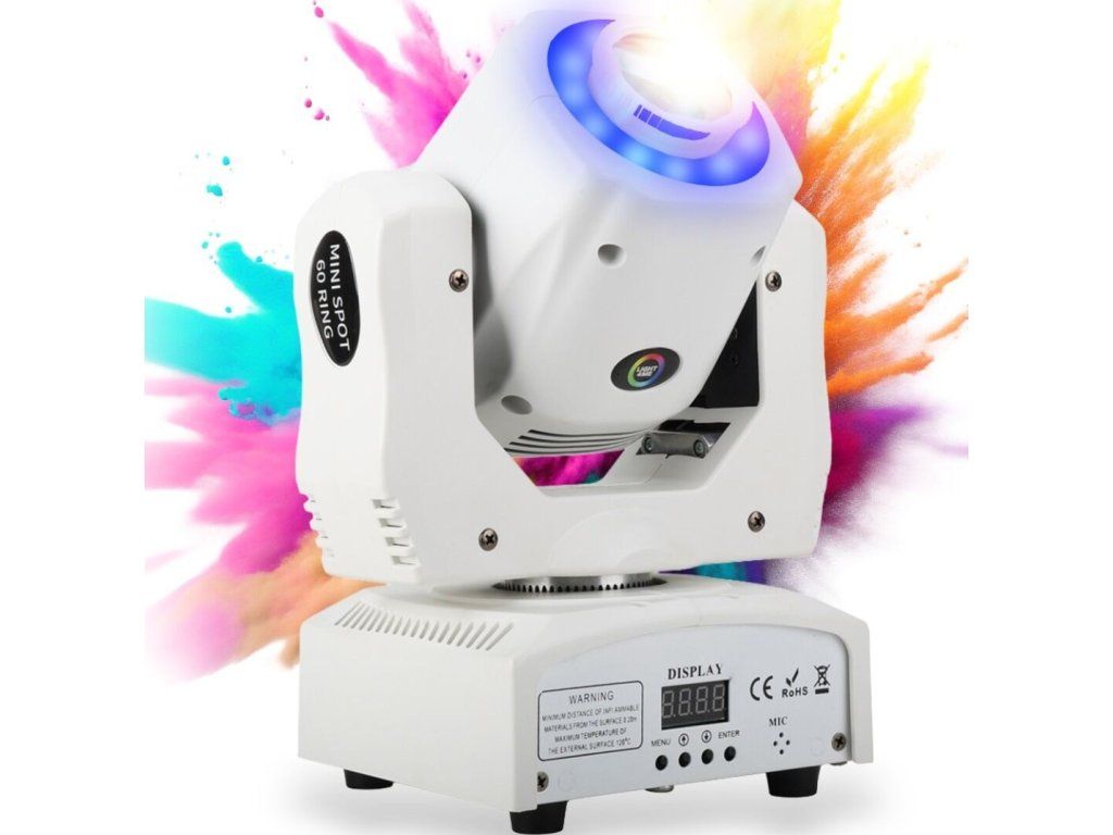 Ring LED RGB s 12 diodami dodává barevnou záři kolem hlavního paprsku světla. Díky tomu může jedna hlava současně vytvářet bodový efekt spot a barevné pozadí, což se obzvláště dobře osvědčuje v malých DJ instalacích.