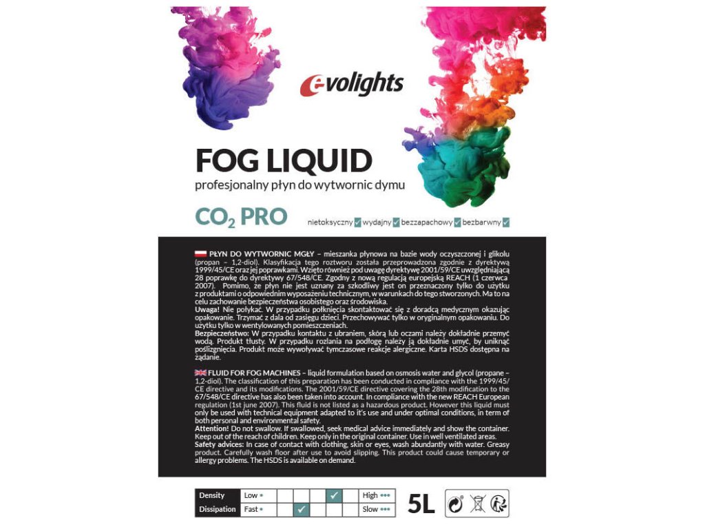 Profesionální náplň do výrobníků mlhy (kapalina do mlhostrojů) vyrobená na bázi čištěné vody a glykolu, určená pro vytváření pódiových speciálních efektů. Roztok je bez zápachu, bezbarvý a netoxický, díky čemuž je jeho použití naprosto bezpečné. Vyznačuje se vysokou účinností a dokonale simuluje efekt vytvářený specializovanými výrobníky mlhy pracujícími na bázi oxidu uhličitého. Vypouštěná pára je hustá, ale zároveň poměrně rychle mizí, takže nedochází k nadměrnému zakouření prostor. Kapalina CO2 je ideální pro vertikální výrobníky mlhy, ve kterých po zahřátí a vypuštění pod vysokým tlakem vytváří působivý efekt vertikálního kouřového sloupu.