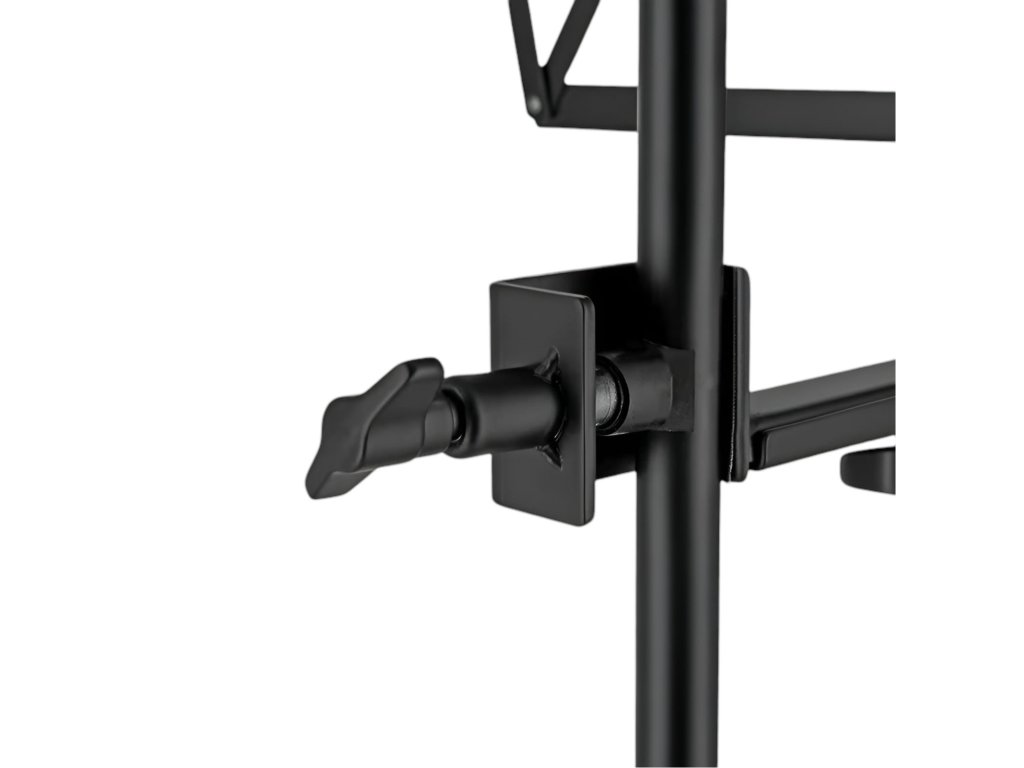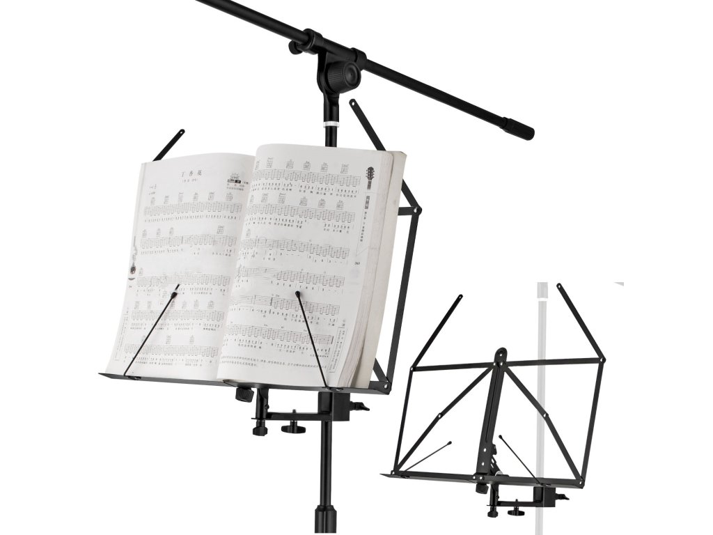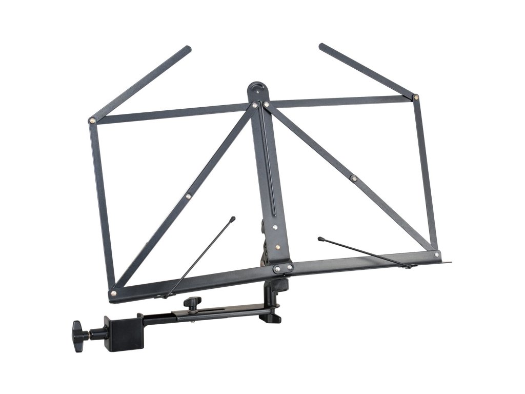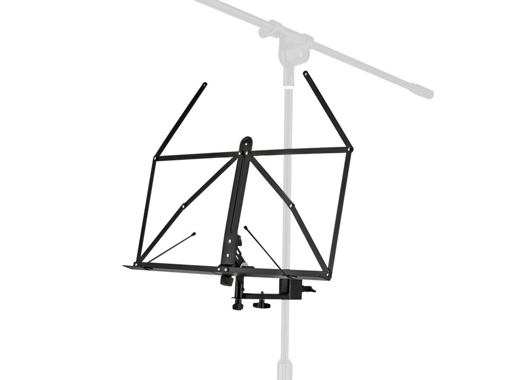 Praktický kovový notový pult určený k snadnému připevnění na mikrofonní stojany. S rozměry 450 x 223 mm poskytuje dostatek prostoru pro umístění not, hudebních knih, tabletu nebo jiného příslušenství. Pult disponuje maximální nosností 1,5 kg a nastavitelnou délkou držáku v rozmezí 140 - 180 mm.