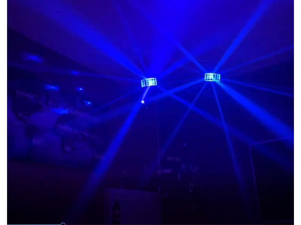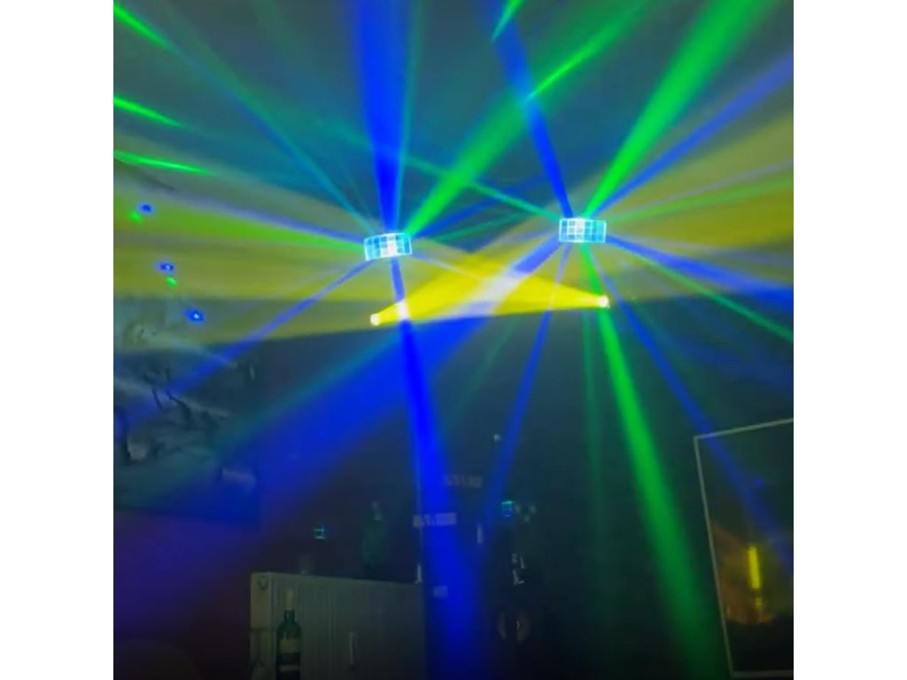 - Světelný zdroj: otočné hlavy: 2x30W LED, derby efekt: 4x10W RGBW LED, efekt bílého stroboskopu: 4x3W W LED, PAR efekty: 12x2W RGBW LED