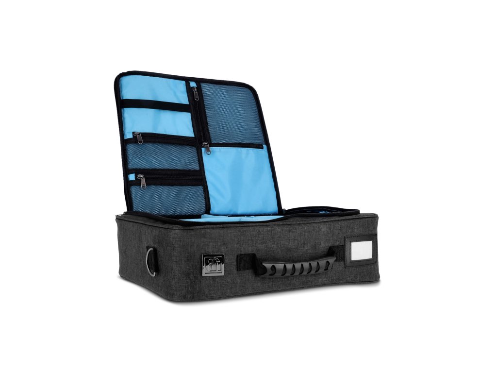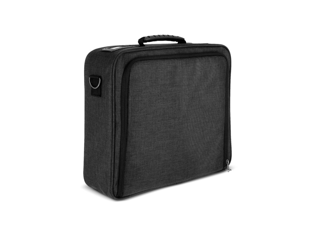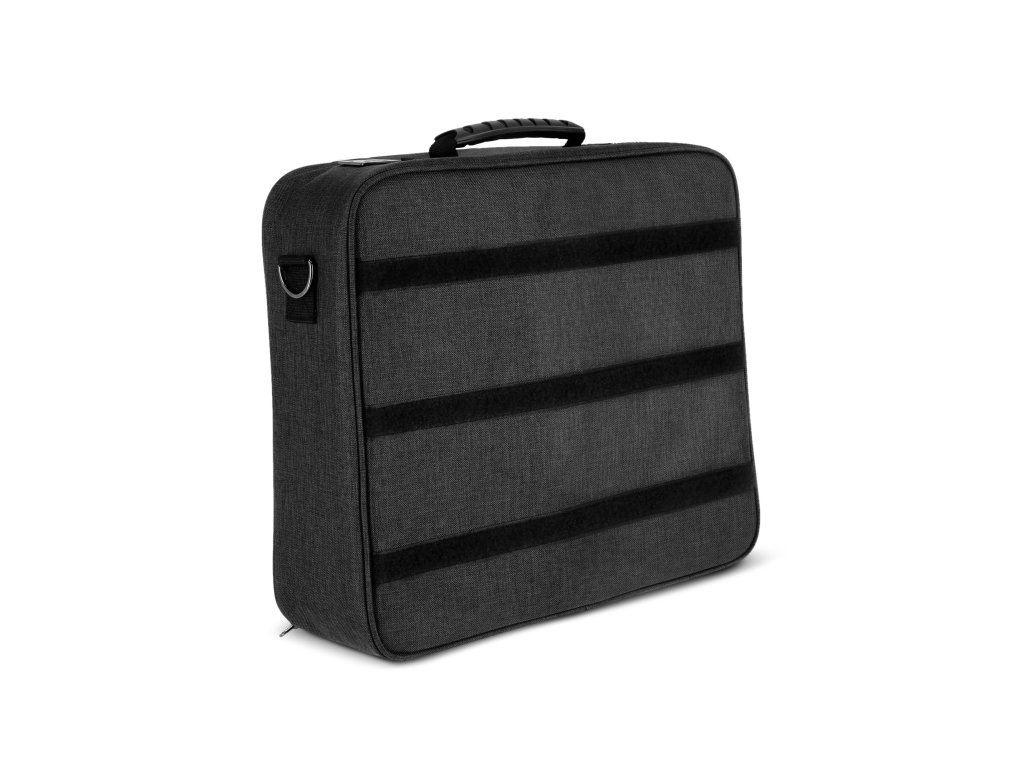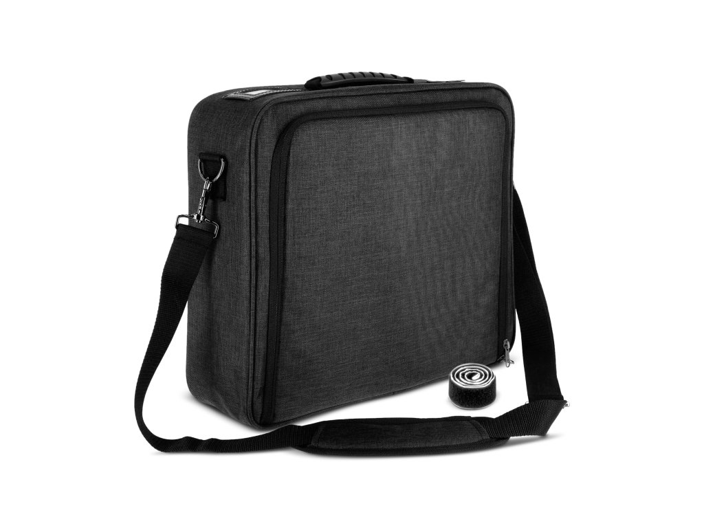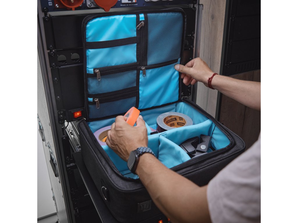 Díky suchému zipu na spodní straně lze tašku bezpečně připevnit do racku nabo na rack (odpovídající druhá část suchého zipu je dodávána v roli v balení). Ergonomická rukojeť a odnímatelný ramenní popruh zajišťují pohodlné nošení i na cestách. Ideální pro všechny, kteří chtějí bezpečně a přehledně ukládat příslušenství, ať už na akci nebo na cestách.