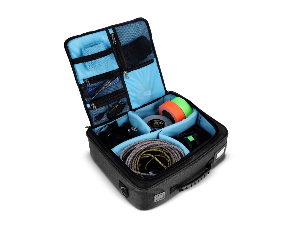 Tři flexibilní přepážky uvnitř lze připevnit k dnu tašky pomocí suchého zipu a zajistit tak přizpůsobení přihrádek vašim potřebám. Další úložné přihrádky na zip v horní části tašky a elastický pásek pro připevnění kabelů činí z této tašky univerzálního společníka.