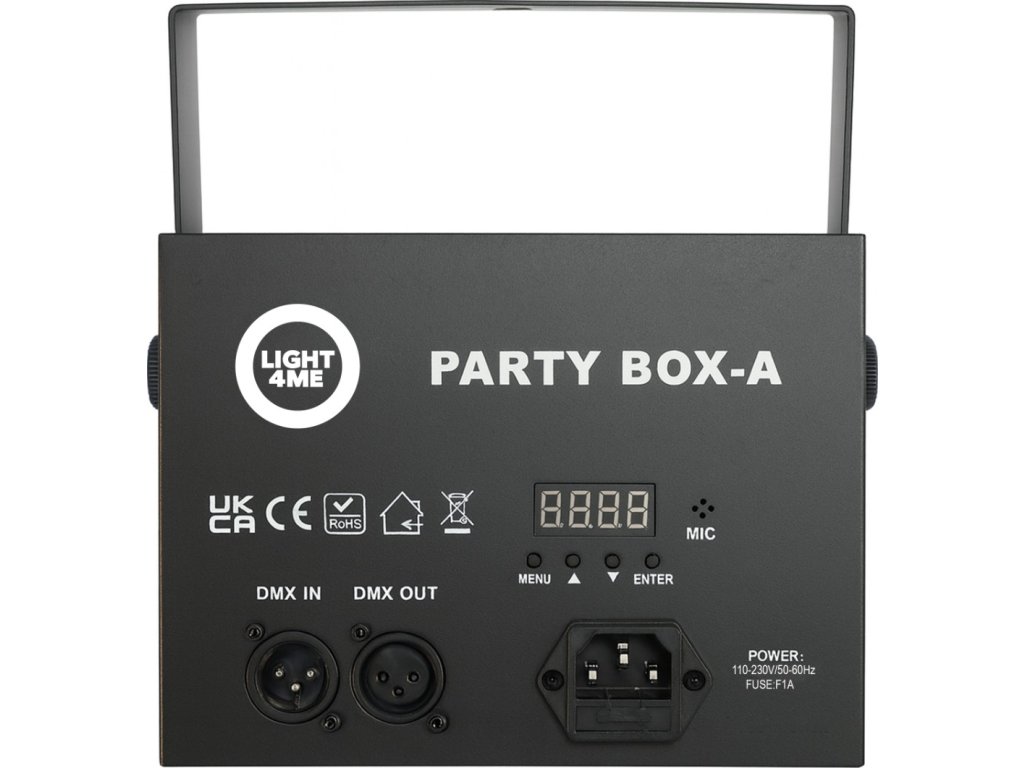 Vybaven gobo efektem s nastavitelnou rychlostí a 6 LED diodami R/G/B/W/P/Y (každá o výkonu 3W), efektem diskotékové koule se 3 diodami R/G/B (každá o výkonu 1W), 100mW červeným laserem a 15mW zeleným laserem a také bílým LED stroboskopem o výkonu 10W. Party Box-A poskytuje velkolepé světelné efekty. Ideálně se hodí na párty v klubu, doma nebo v banketních sálech a vytvoří show, na kterou se nezapomíná.