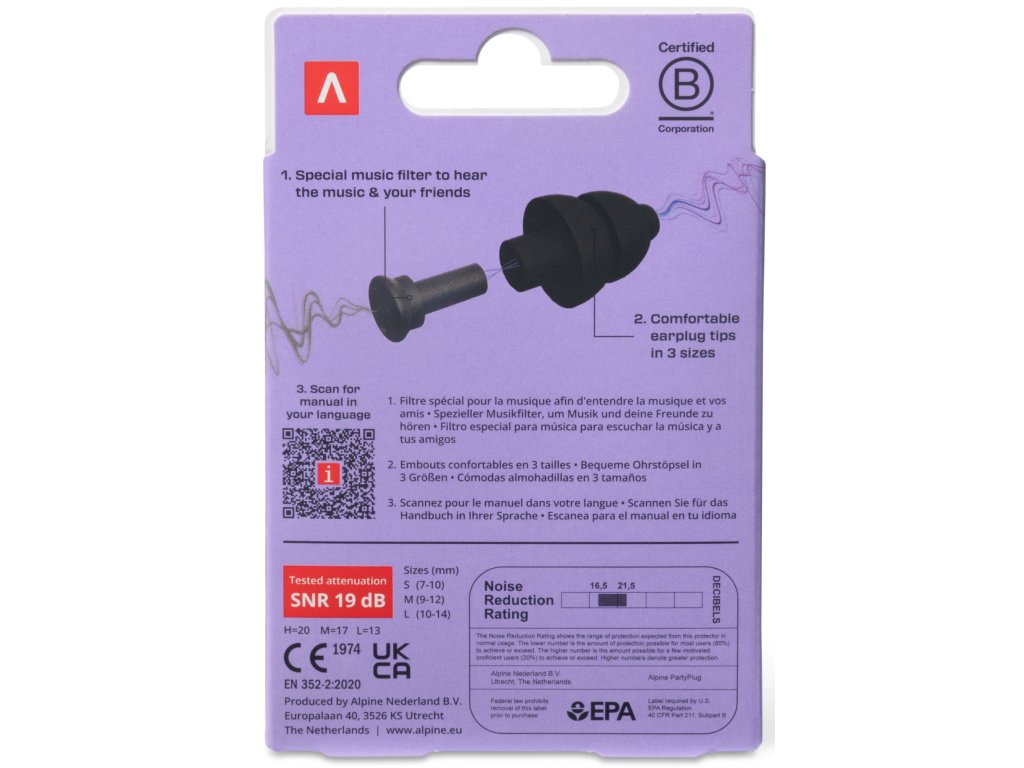 Alpine PartyPlug black jsou moderní špunty do uší navržené pro milovníky hudby, kteří si chtějí užít hlasité zážitky bez rizika poškození sluchu. Díky speciálnímu hudebnímu filtru účinně snižují nebezpečné hladiny hluku až o 19 dB. Klíčové je, že při tlumení hluku nedochází k zkreslení kvality hudby a vy stále bez problému uslyšíte hudbu a budete moci komunikovat s přáteli.