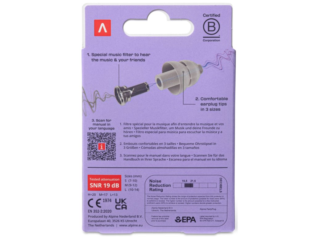 Nová generace PartyPlug nabízí vylepšené pohodlí díky třem dodávaným velikostem koncovek (S/M/L), které se snadno přizpůsobí každému uchu. Ergonomický design s rozšířeným filtrem zjednodušuje manipulaci a zaručuje pevné a stabilní usazení.