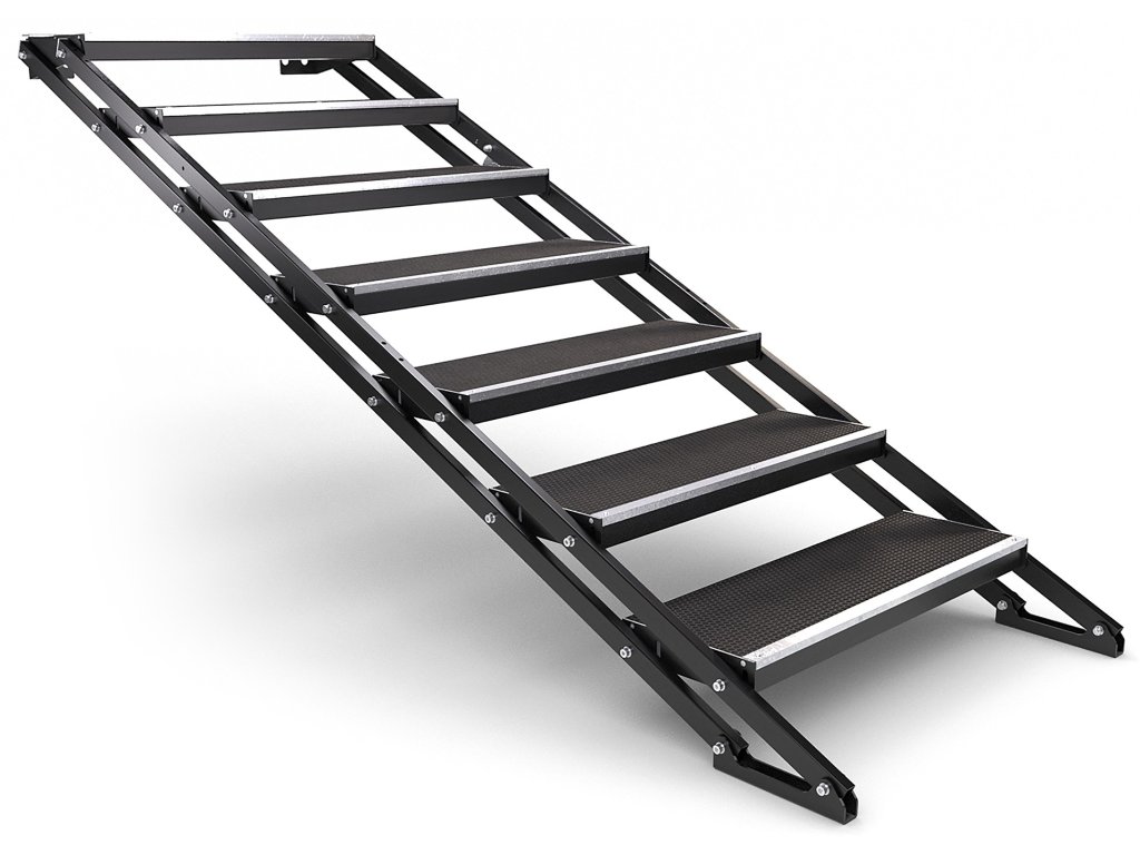 Nastavitelné schody zajišťují rychlou a hladkou montáž. Jsou vyrobeny z vysoce odolných ocelových profilů. Horní část je vyrobeny z překližky a má náš speciální protiskluzový povlak „Hexa“, který zajišťuje maximální přilnavost, díky čemuž je vhodný jak pro vnitřní, tak pro venkovní použití.