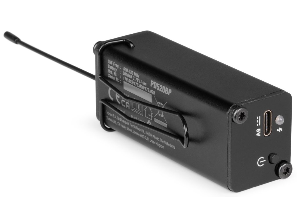 - Vestavěný napájecí zdroj USB pro nabíjení baterií mikrofonu/vysílače