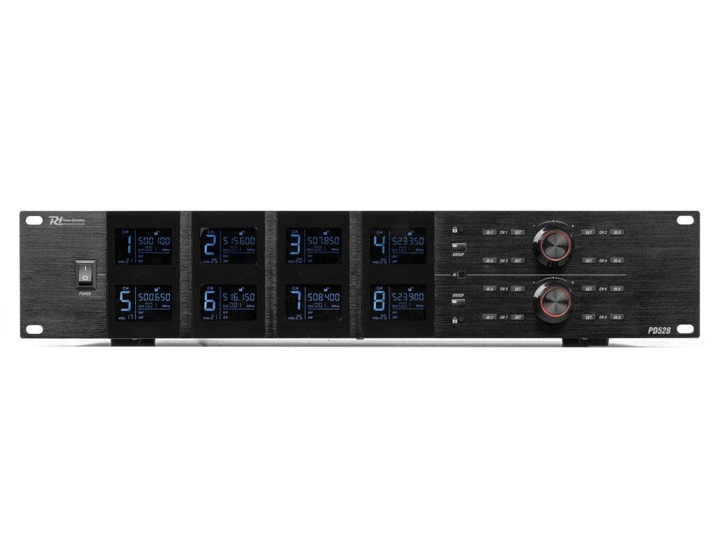PD528 je profesionální bezdrátový mikrofonní systém vybavený 8x 100 kanály a je určen pro větší vystoupení nebo akce. Přijímač s přehledným dynamickým LCD displejem zajišťuje přenos bez rušení, spolu s kvalitním squelchem a PLL syntezátorem. Mikrofonní systém PD528 pracuje v pásmu 500-530 MHz a je vhodný pro vokály, prezentace, školení a další PA-aplikace. Tato sada se dodává s 8-kanálovým přijímačem UHF, 8 ručními mikrofony s dobíjecí li-ion baterií, 2 odnímatelnými anténami BNC, 2 prodlužovacími kabely pro přední montáž antén, napájecím adaptérem a kufrem ABS. Součástí balení je také 8 kabelů USB pro nabíjení bezdrátových mikrofonů.