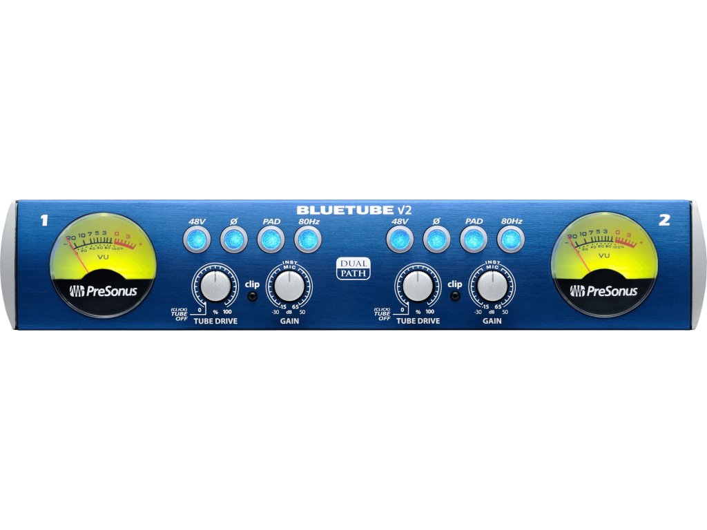 Presonus jej nyní vylepšil v podobě BlueTube DP v2. Polovodičovou cestu nyní zajišťují Class A XMAXTM předzesilovače s proměnným zesílením až 80dB. O teplý zvuk v lampové cestě se stará elektronka 12AX7, pracující s dvojnásobným napětím, než ostatní předzesilovače v této třídě a tak poskytuje prostornější zvuk s nižším šumem, high-end jasností a ještě jemnější lampový zvuk než jeho předchůdce.