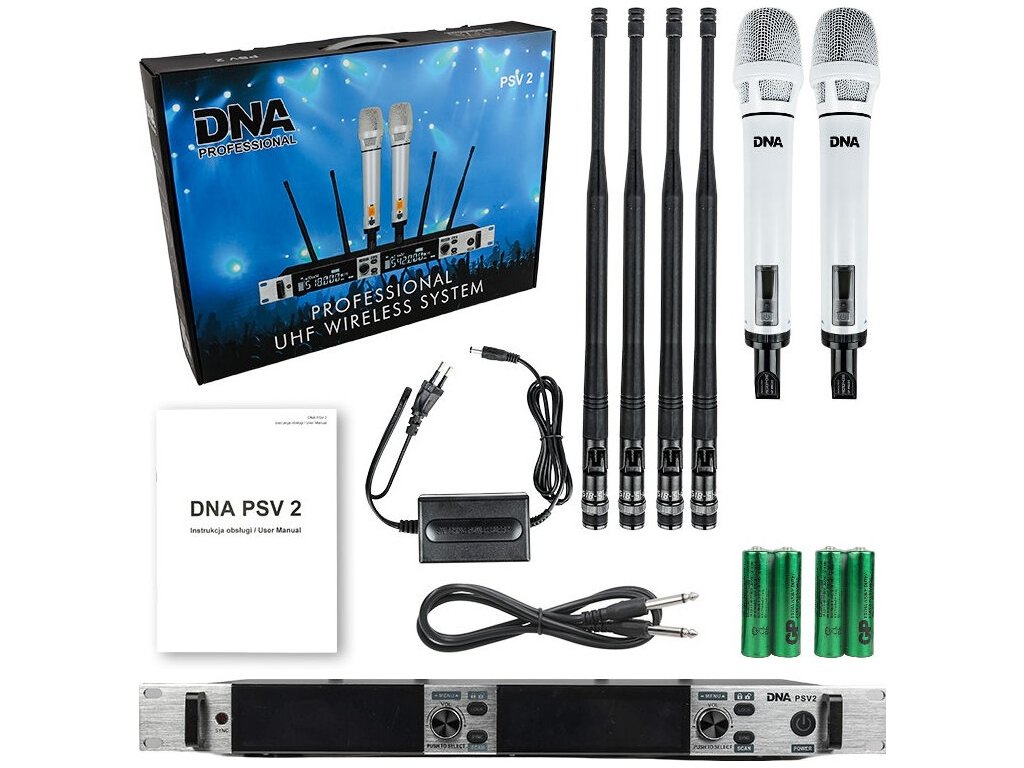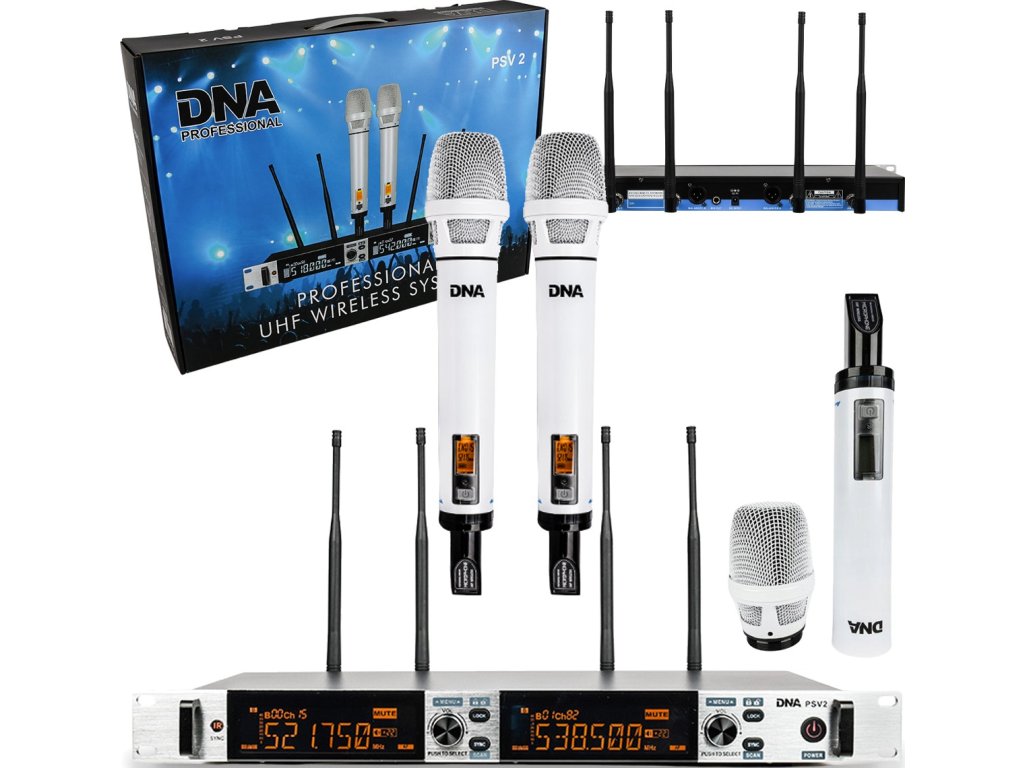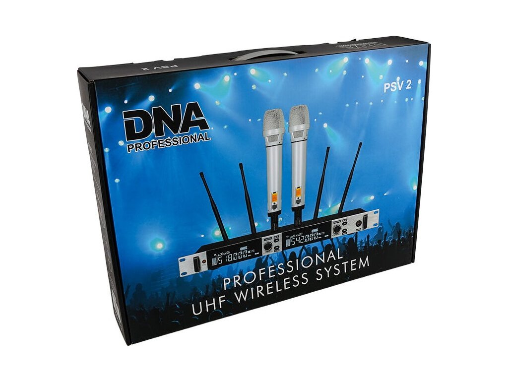 DNA PSV 2 je vysoce kvalitní bezdrátový mikrofonní systém postavený na nejnovější digitální technologii. Naměřený dosah činí cca 100 m bez rušení. Sada se skládá z dvou bezdrátových mikrofonů a kompaktního přijímače UHF vln, který se zapojuje přímo do vstupu zesilovače nebo audio mixu. Set se ideálně hodí jako ozvučení pro svatební kapely, eventové agentury, animátory her a zábav, jako sada mikrofonů pro karaoke, a také pro různé typy kulturních a vzdělávacích institucí, přičemž zajišťuje vynikající kvalitu zvuku v každé situaci.