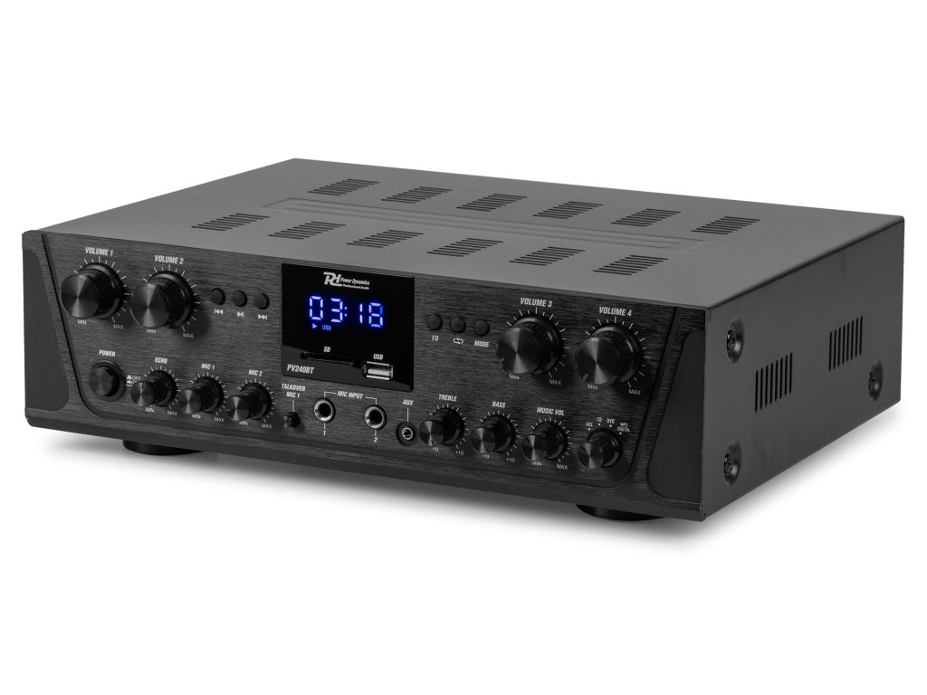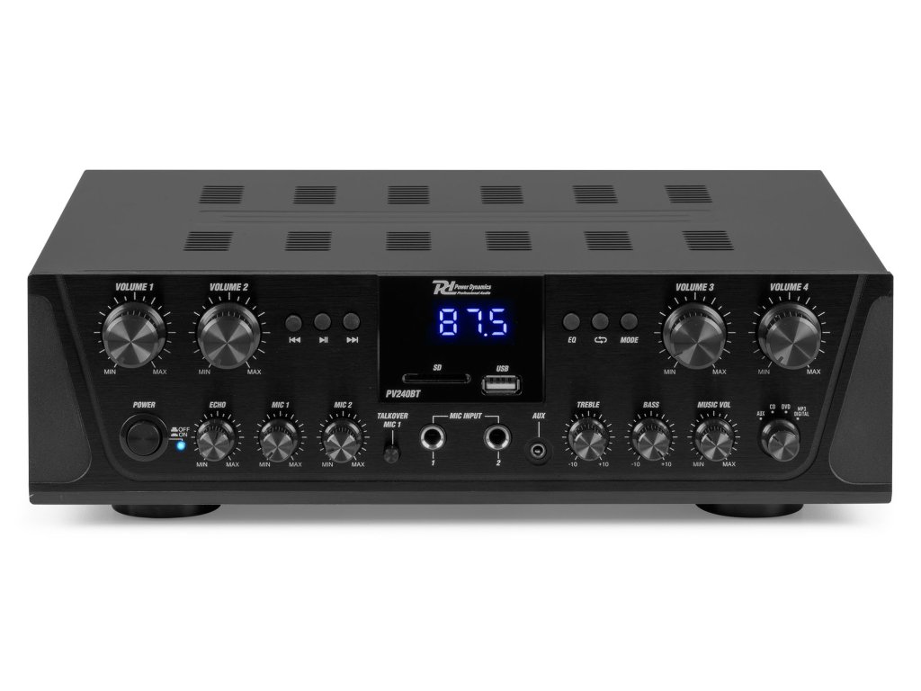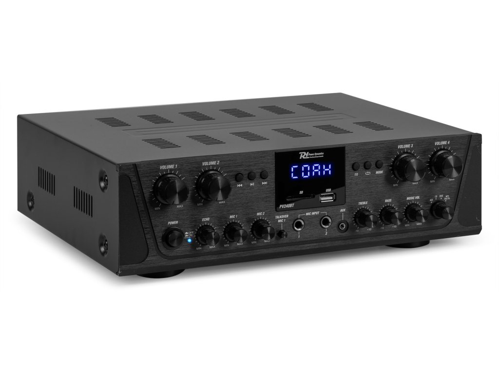 Řada PV2 je řada inteligentních stereo vícekanálových zesilovačů vybavených pokročilou bezdrátovou technologií 4.2 BT a fungují se všemi nejnovějšími zařízeními včetně smartphonů, tabletů, notebooků a počítačů. Užijte si sladký zvuk streamovaný z vaší osobní digitální hudební sbírky. Všechny systémy nabízejí možnost posílat hudbu nebo oznámení s nastavitelným ovládáním hlasitosti pro každý kanál. Díky slotu pro USB / SD kartu pro přehrávání MP3 / WMA, FM rádio s LED displejem a dvěma mikrofonními vstupy s ovládáním tónu a zvuku Bass / Treble, je tento zesilovač vhodný pro domácí nebo kancelářské použití.