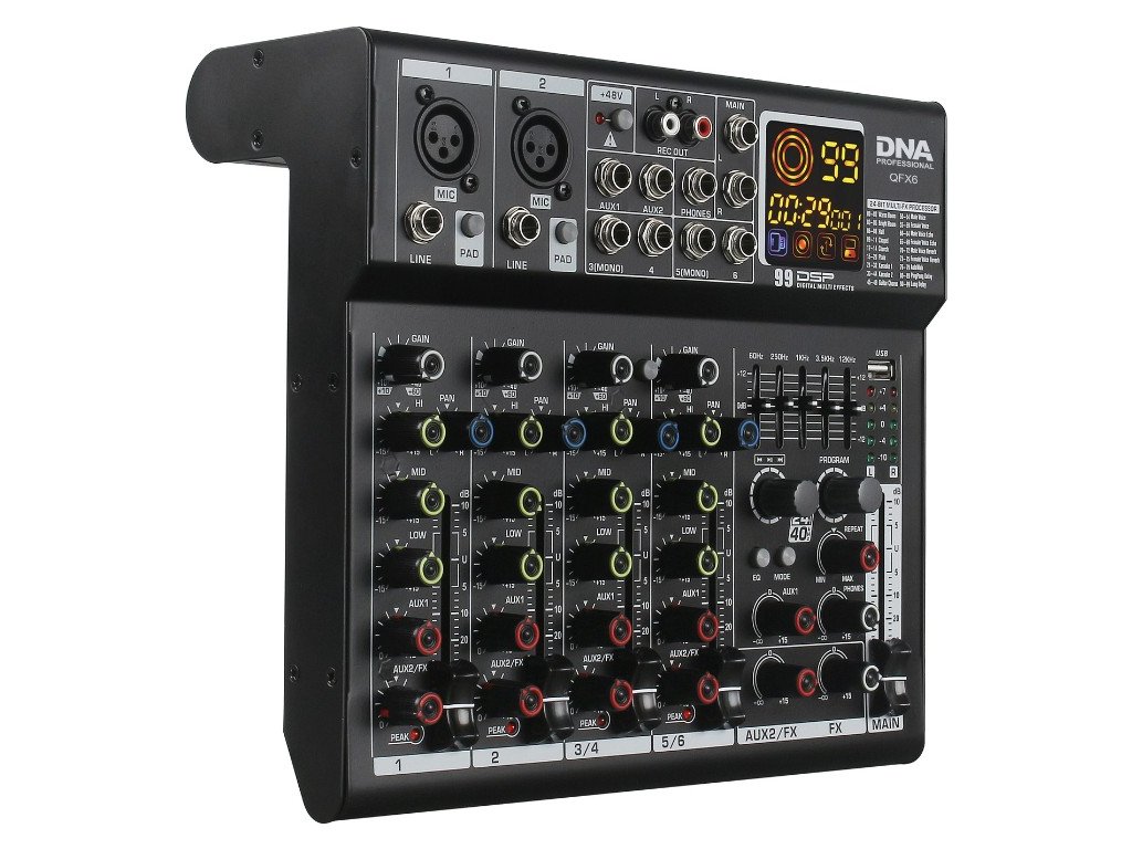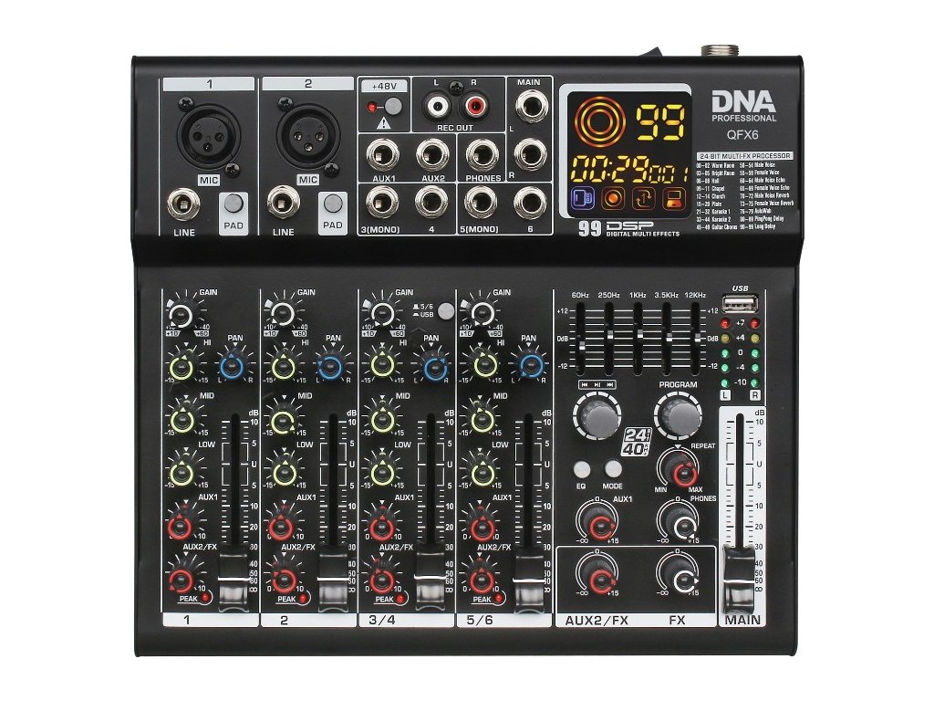 NA QFX6 je vybaven dvěma mono vstupy typu XLR (MIC) a jack 6,35 mm (LINE) a také čtyřmi mono vstupy (jack 6,35 mm) – díky nim můžeme k mixu připojit mikrofon, ale také DJ konzoli nebo např. klávesový nástroj. Uživatel může bez problémů ovládat úroveň zesílení (gain) zvukového signálu, úroveň zkreslení signálu díky indikátoru PEAK, frekvenční rozsah výšek, středů a basů kanálu a také nastavit úroveň signálu pro každý ze vstupů a výstupů pomocí pohodlných, ergonomických faderů a potenciometrů. Díky USB-B vstupu – umístěnému na zadní straně mixu – a přiloženému kabelu lze rychle připojit mixážní pult k počítači. Vestavěný port USB-A umožňuje připojit USB flash disk s audio soubory a jejich přehrávání pomocí intuitivního MP3 přehrávače ovládaného pohodlným potenciometrem. Katalog funkcí mixu rozšiřují přepínače PAD, díky kterým lze snížit úroveň signálu o 26 dB. Dalšími přednostmi DNA QFX6 jsou také vysoce kvalitní 24bitový DSP procesor s 99 efekty, 5pásmový stereo grafický ekvalizér a potenciometr pro ovládání úrovně efektu REPEAT.