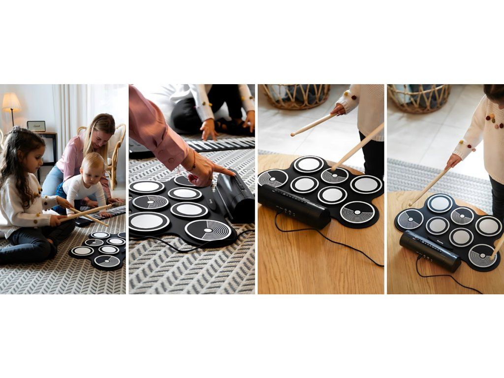 Sníte o hraní na bicí, ale nemáte místo na plnohodnotnou soupravu? V-TONE RD7 je pro vás ideálním řešením – rolovací, lehká a kdykoliv k akci připravená bicí souprava. S vestavěnými stereo reproduktory 2x3W a intuitivním ovládáním můžete cvičit, nahrávat a bavit se rytmem v pohodlí domova nebo na cestách. Sedm citlivých padů a realistické zvuky zajišťují zábavu ze hry pro začátečníky i pokročilé. Skvělá volba pro děti, studenty hudby i dospělé objevující vášeň pro bicí.
