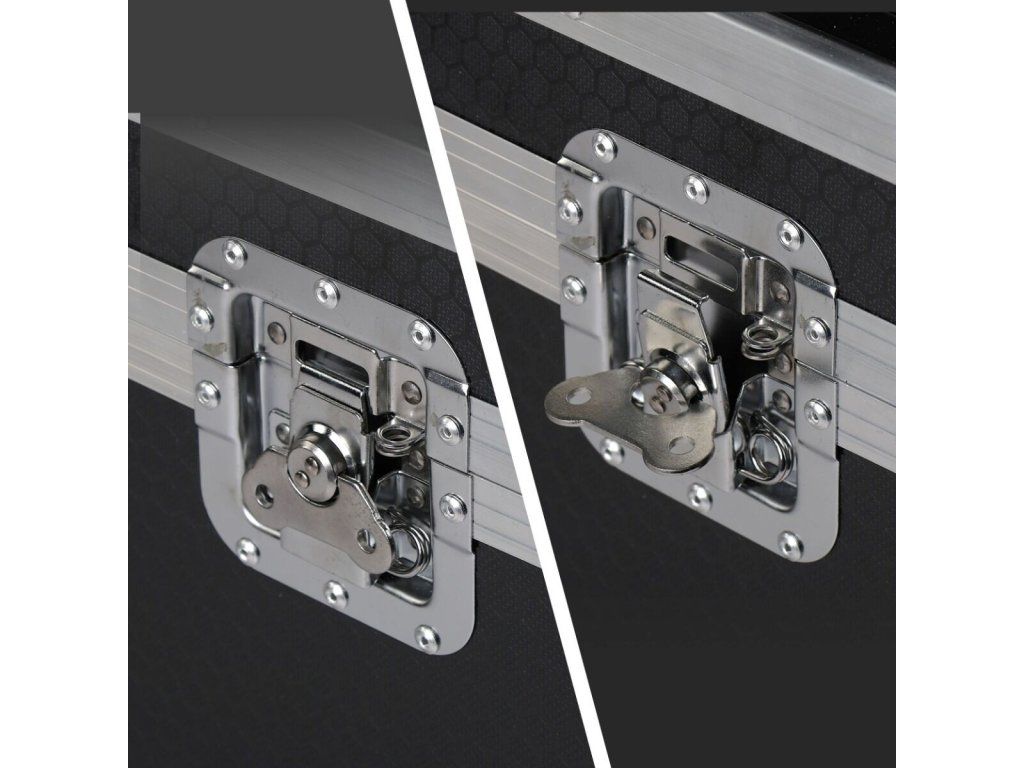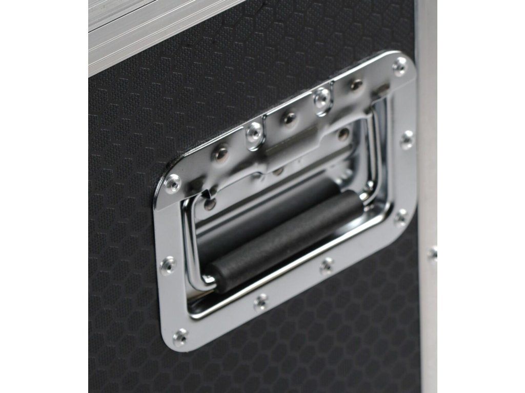 Motýlkové zámky zaručují bezpečné a rychlé uzavření. Rohové kulové ochrany navíc zabezpečují kufr před poškozením během časté nakládky a vykládky. Černo-stříbrný design skvěle ladí s ostatním scénickým vybavením a podtrhuje profesionální charakter vaší realizace.