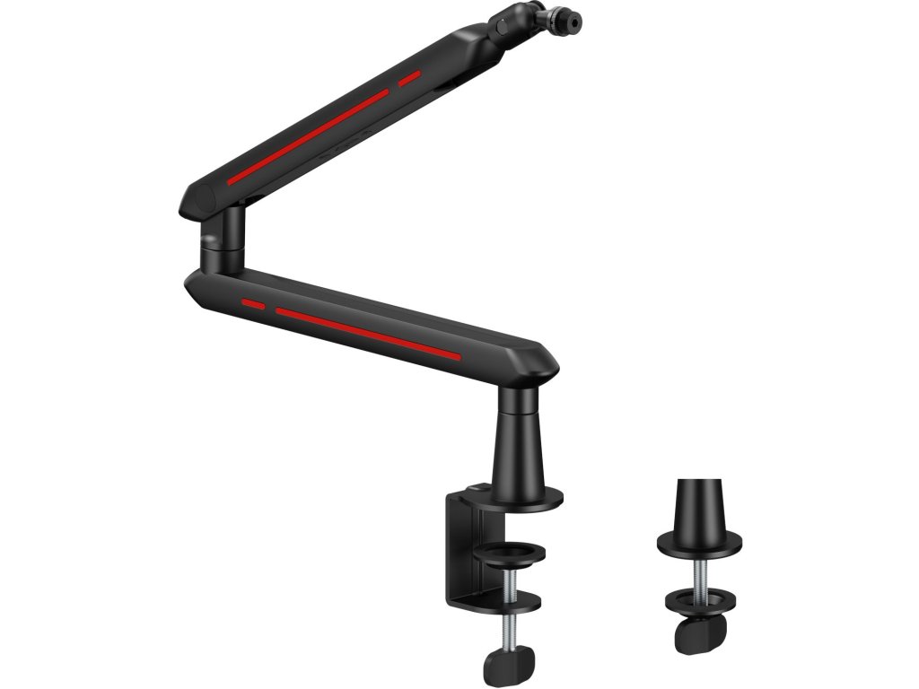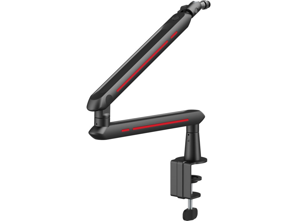 Rameno je konstruováno z odolných materiálů včetně hliníku a oceli, což zajišťuje jeho stabilitu a dlouhou životnost. Matně černá povrchová úprava s červeným akcentem dodává moderní a profesionální vzhled vašemu pracovnímu nebo hernímu prostoru.